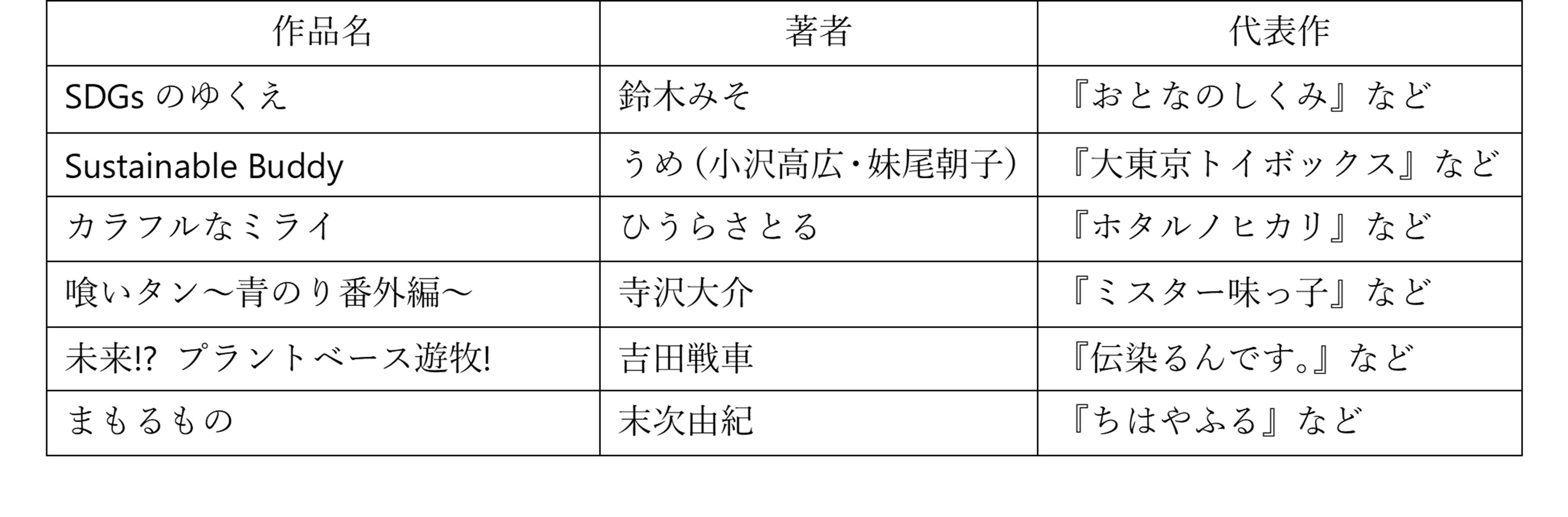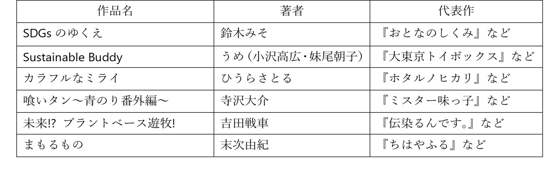 6組の著名漫画家によるSDGsへの共感を生むマンガと、SDGsを正しく理解するためのコラムで構成し、SDGsの全体像を伝える内容です。