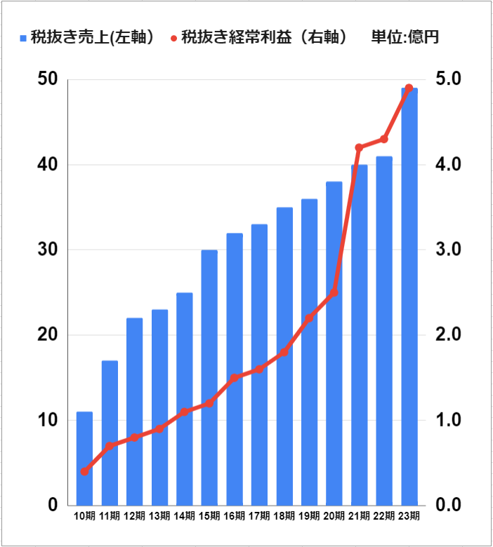 2023年4月末までの業績から、23期(2022年7月1日~2023年6月30日)も増収増益見込みとなっております。※下記グラフ参照