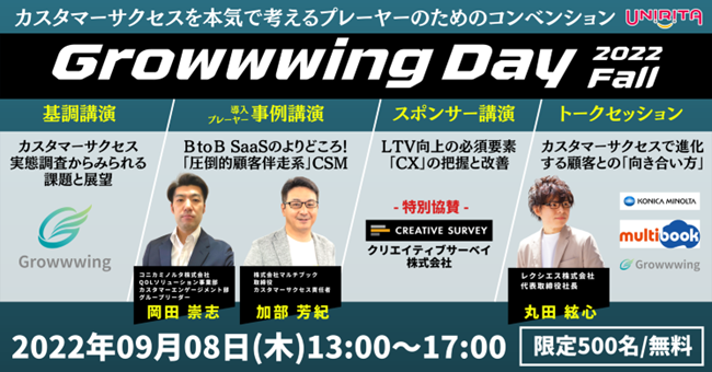 株式会社ユニリタ(本社:東京都港区、代表取締役 社長執行役員 北野裕行、東証スタンダード市場:3800、以下 ユニリタ)が提供するSaaS事業の成長ドライバーであるカスタマーサクセスプラットフォーム「Growwwing(グローウィング)」は、リリースから2年目を迎えます。そこで、今秋、同サービスの導入企業の方々を登壇者として招き、日々カスタマーサクセス業務に取り組む者としての体験談を余すことなく語っていただく「Growwwing Day 2022, Fall」を9月に開催いたします。