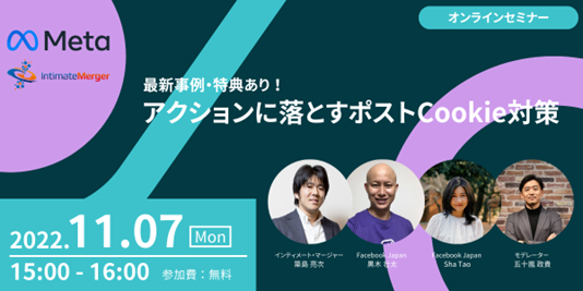 国内最大級パブリックDMPを提供するデータプラットフォームカンパニーの株式会社インティメート・マージャー(本社:東京都港区、代表取締役社長:簗島 亮次、以下当社)は、Meta日本法人 Facebook Japanをゲストとして迎えたセミナー「【Intimate Merger x Meta】最新事例・特典あり!アクションに落とすポストCookie対策」を11月7日(月)15時より実施することをお知らせします。