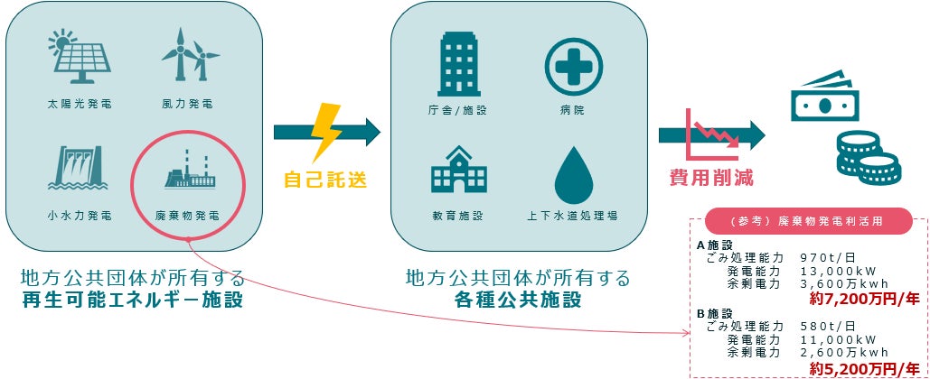 地方公共団体が所有する再生可能エネルギー施設で発電した電力の自己託送によって公共施設等の電気料金を削減し、地方公共団体に不足する脱炭素活動予算を創出することができ、再生可能エネルギー施設の新規開発などに投資することができます。自己託送に係る複雑な手続きや開始後の運用やリスク管理まですべて当社が代行します。
