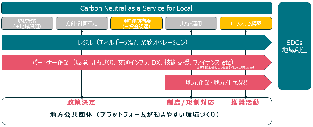 CNaaS for Localの最大の特徴は、地方公共団体が地域企業や住民の参画を得ながら持続的に脱炭素活動ができるために、脱炭素の活動予算を創出する「推進体制の構築」と、脱炭素のポテンシャルを最大化する地域ネットワーク化を図る「エコシステムの構築」です。脱炭素活動へかけるリソースが不足する地方公共団体は、CNaaS for Localを通して、活動予算を調達し、地域企業や住民が参画するエコシステムにおいて脱炭素を持続化することができます。