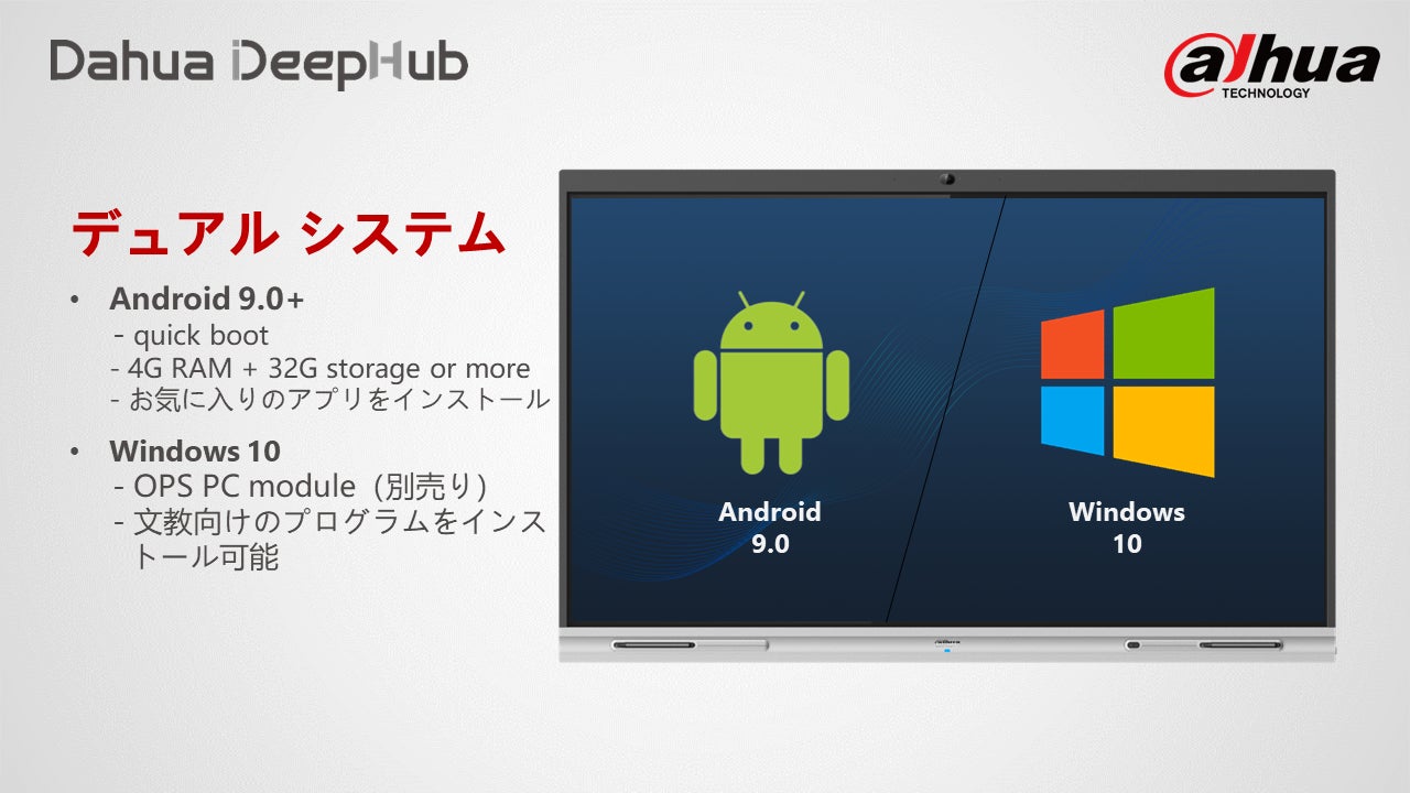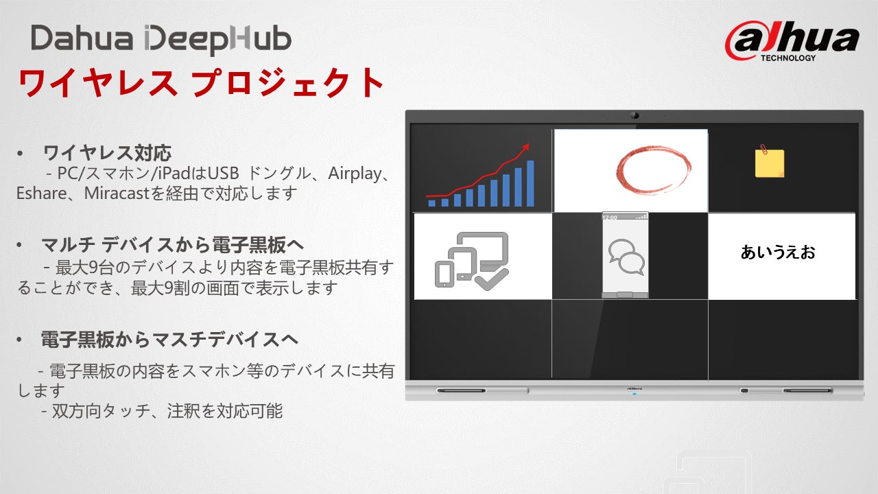 Dahua Technology Japan 合同会社(所在地:東京都中央区、 職務執行者:リー・ビン)は、ユーザーの様々なニーズに応える機能性を備えており、会議の体験と効率を上がる、リモートミーティングと遠隔教育のレベルは進化させます。Dahuaのイノベーションとテクノロジーの強みを生かし、従来の会議手法の一般的な問題を解決し、時代遅れで不便なホワイトボードとプロジェクターのセットアップに代わる、格段に良い選択肢となります。本ソリューションは2022年9月より発売します。