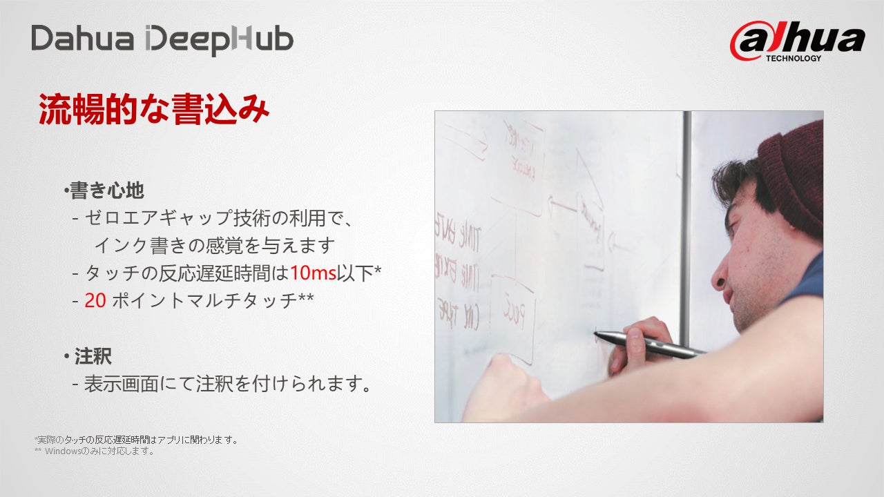「Dahua DeepHubはビデオ、オーディオ、高精細ビデオ送信などのコア技術におけるDahuaの強みを組み合わせて、スマートインタラクティブホワイトボードのあらゆるモデルをラインアップしています。エントリーレベルのLiteシリーズからハイエンドのProシリーズまでをとり揃え、今日のIoT世界においてビジネスユーザーと教育分野のユーザーに高まりを見せるデジタル化とコラボレーションに向けたニーズにお応えします。」(Josh Wang氏)