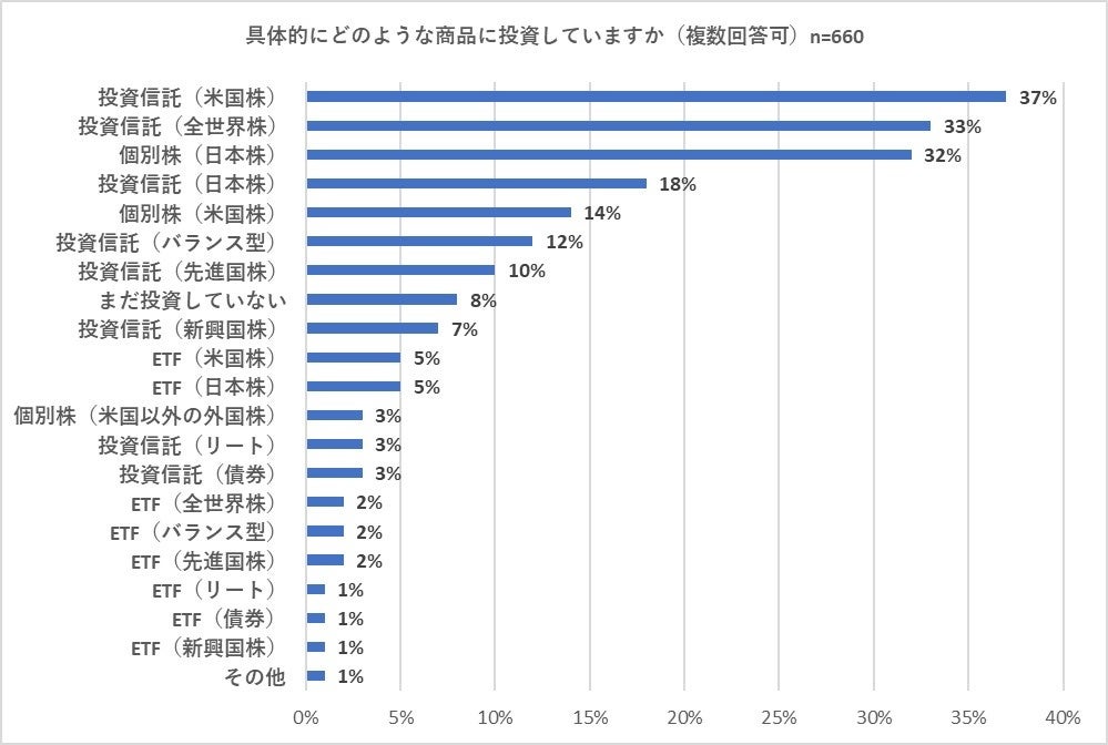 続いて、660人に対して「具体的にどのような商品に投資していますか」と複数回答可で質問したところ、「投資信託(米国株)」、「投資信託(全世界株)」、「個別株(日本株)」がトップ3となりました。以下、「投資信託(日本株)」(18パーセント)、「個別株(米国株)」(14パーセント)が続きました。「投資信託(全世界株)」の約6割が米国株への投資であることを考慮すると、米国株と日本株に人気が集中していると言えそうです。