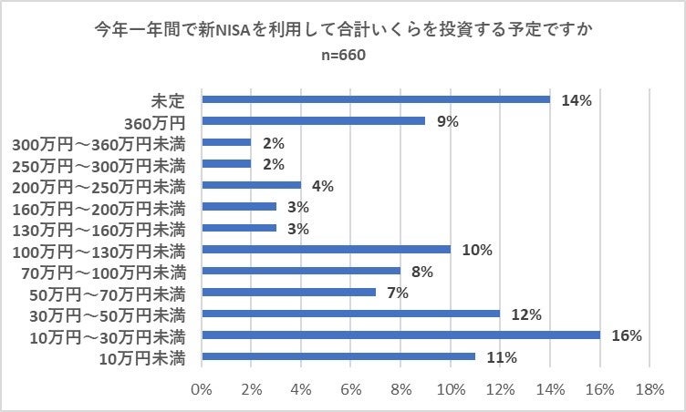 さらに、新NISA口座を開設している660人に対して「今年一年間で新NISAを利用して合計いくらを投資する予定ですか」と質問しました。その結果、「10万円~30万円未満」が16パーセントでトップ。以下、「未定」(14パーセント)、「30万円~50万円未満」(12パーセント)が続きました。また、9パーセントの方が年間投資枠の上限である「360万円」と回答。過半数の54パーセントの方が「100万円未満」と回答したこともわかりました。
