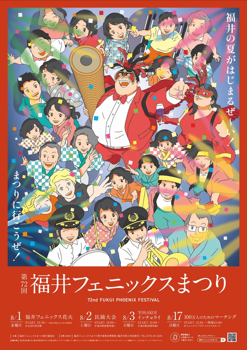 夜空を彩るフェニックス花火、世代を超えて踊り継がれる民踊大会、踊り手たちの情熱あふれるYOSAKOIイッチョライ、圧巻のマーチングが福井の夏を盛り上げます!