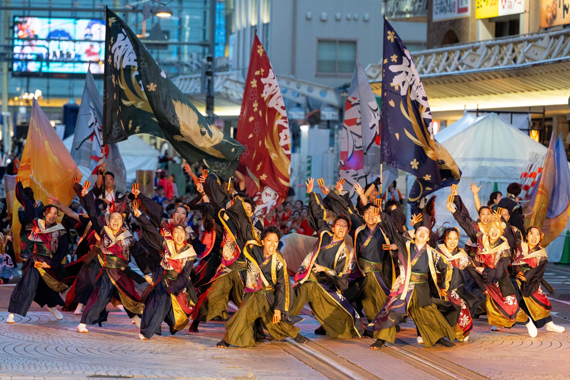 福井県内外のYOSAKOIチーム22チームが駅前電車通りにてパレード演舞を2回踊ります。優秀チーム6チームによるファイナル演舞でフェニックス大賞を決定します。