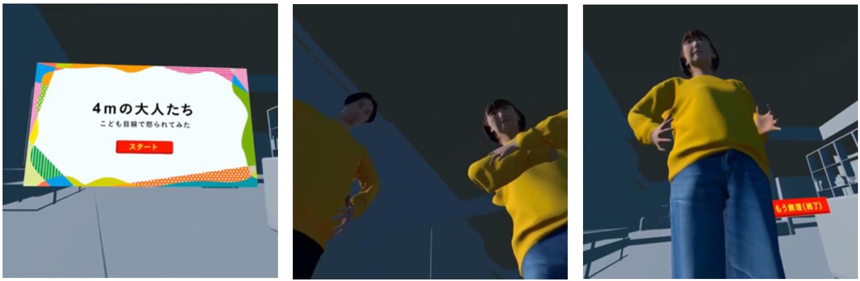 私たちがこどもになったとしたら、大人は4m級の巨大生物。そんな巨大生物に見下ろされて怒られた時の怖さをVR映像“4mの大人たち”で体験いただけます。
