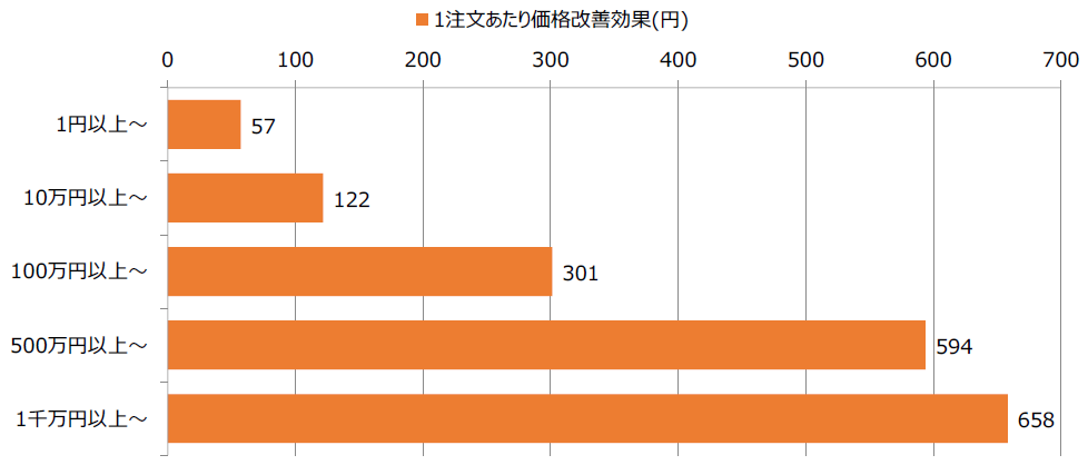 SOR利用による価格改善効果があった注文件数は全体の14%。上表はその1注文あたり約定金額別実績です。