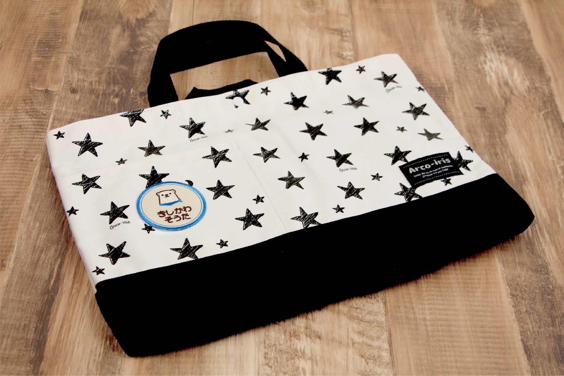 スタンプのイラストから展開したため、刺繍で表現をしてもイメージを変えることなく出来上がりました。ぷちスタンプやお名前シールとお揃いで、文字の読めないお子さまも判別できるマイマークとしてお使いいただけます。