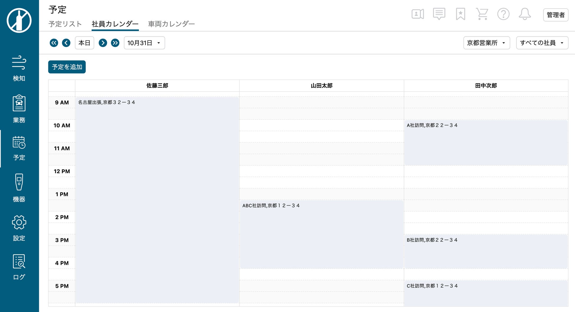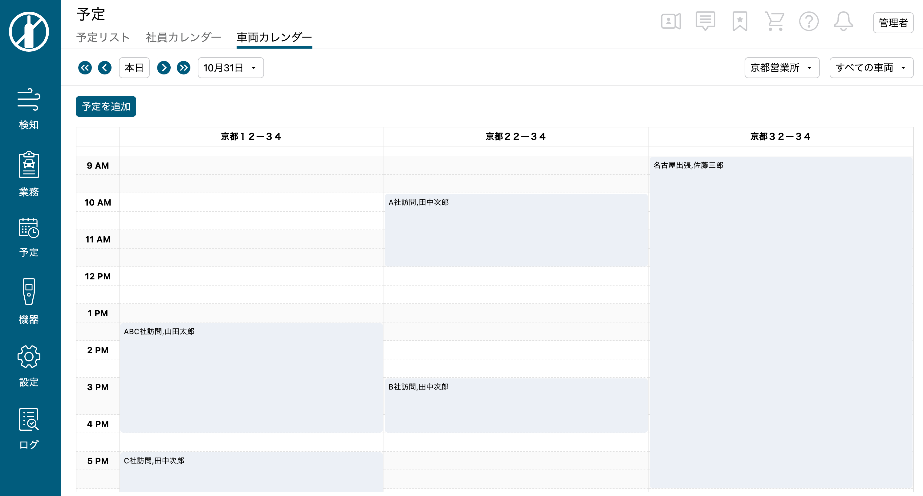 管理者は車両予約・社員の予定を確認する事ができます。編集も可能です。