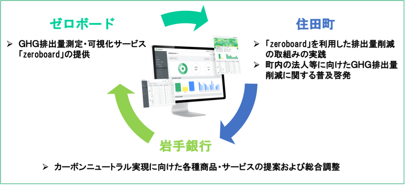 当社と岩手銀行および住田町の三者は、相互に連携して、「zeroboard」の利用を通じた地域の脱炭素への支援強化を図ることを目的として、住田町内における脱炭素社会の実現に向けた基本合意書を締結いたしました。
