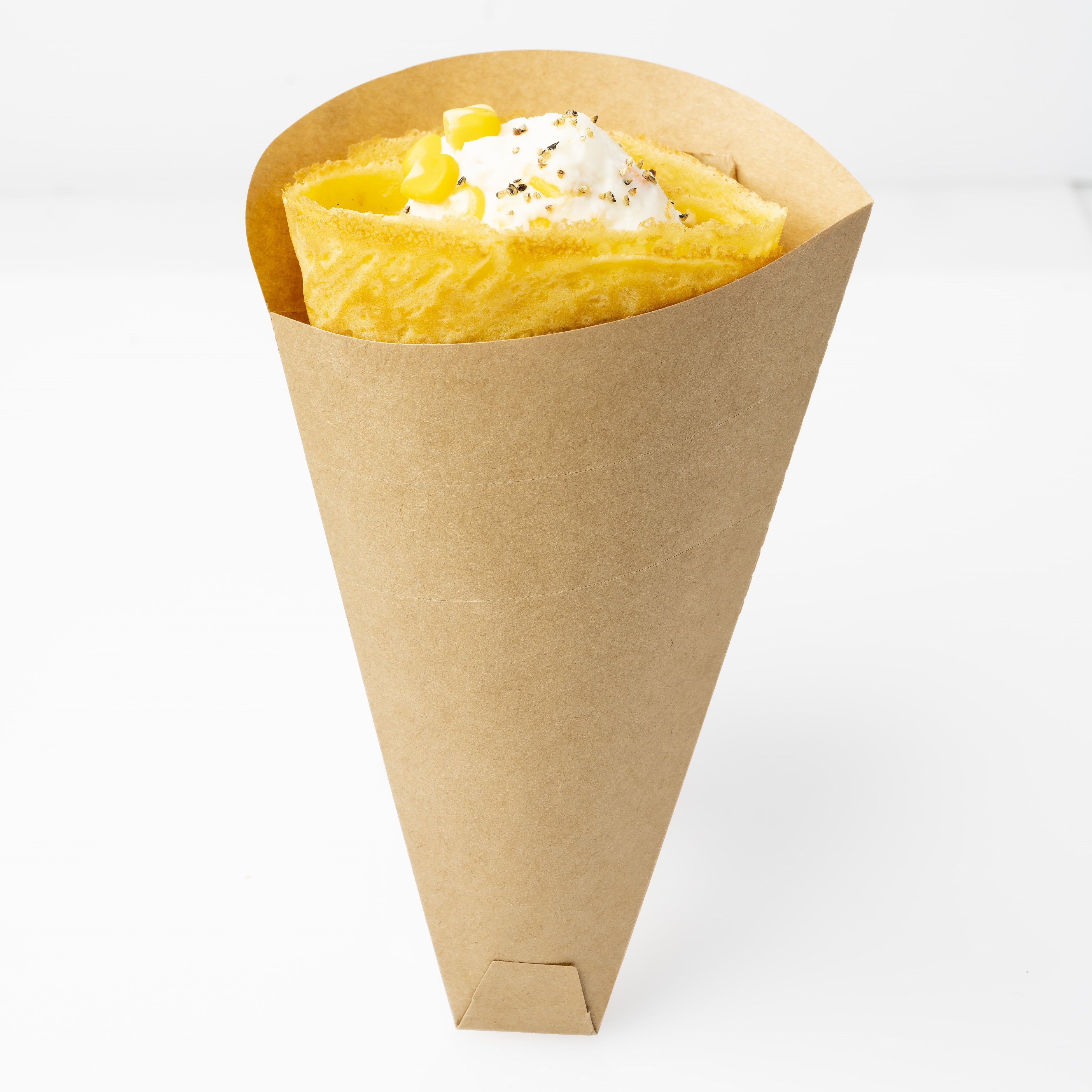 大阪・関西万博の「FOODTECHERS by ユーハイム」で販売し大好評だったバウムクレープが再登場!バウムクーヘンの生地を使っているため、もっちりとした食感と、甘いメープルシュガーがやみつきになります。