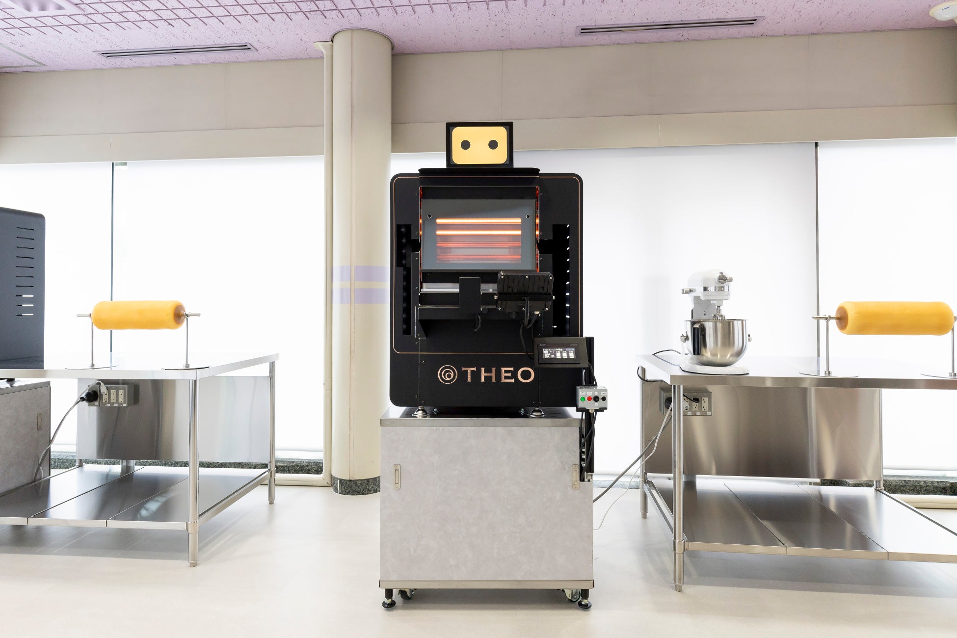 THEO(テオ)は株式会社ユーハイムが開発したバウムクーヘンAI職人です。職人が焼く生地の焼き具合を各層ごとに画像センサーで解析し、その技術をAIに機械学習させデータ化、無人で職人と同等レベルのバウムクーヘンを焼きあげることができます。ユーハイムの熟練職人のほか、ロボット工学の研究者、AIの専門家、デザイナーなど様々なプロフェッショナルの協力のもと、約5年の開発期間を経て誕生しました。