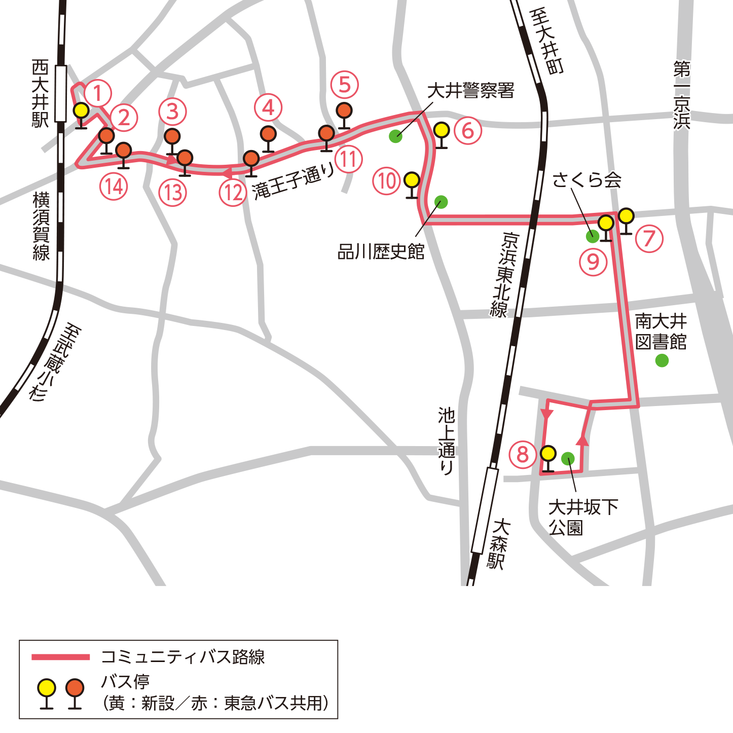 区間は西大井駅から大森駅を結ぶルートで、1時間あたり2本運行します。運行は東急バス株式会社が行い、運賃は大人220円、小児110円、東京都シルバーパスも利用することができます。