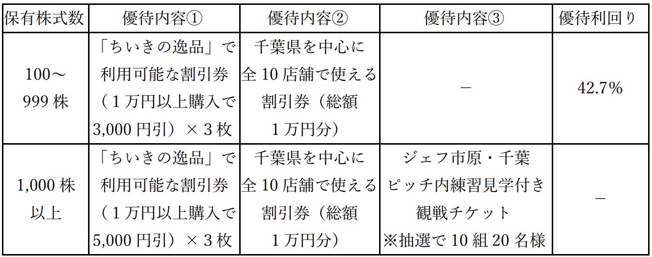 当社は、株式の投資魅力向上および当社事業へのご理解促進を目的として、2025年1月10日付けで「株主優待制度の大幅変更(拡充)のお知らせ」を公表いたしました。その後寄せられた株主の皆様からのご意見を踏まえ、より使いやすい制度となるよう一部内容を見直すとともに、中長期的な株式保有を促進し、厚くご支援くださる株主様への感謝の意を込めて、10単元(1,000株)以上保有の方を対象とした新たな優待制度を新設いたしました。これに伴い、当社がアシストスポンサーを務めるジェフユナイテッド市原・千葉のピッチ内練習見学付き試合観戦に抽選でご招待する優待内容を追加いたしました。