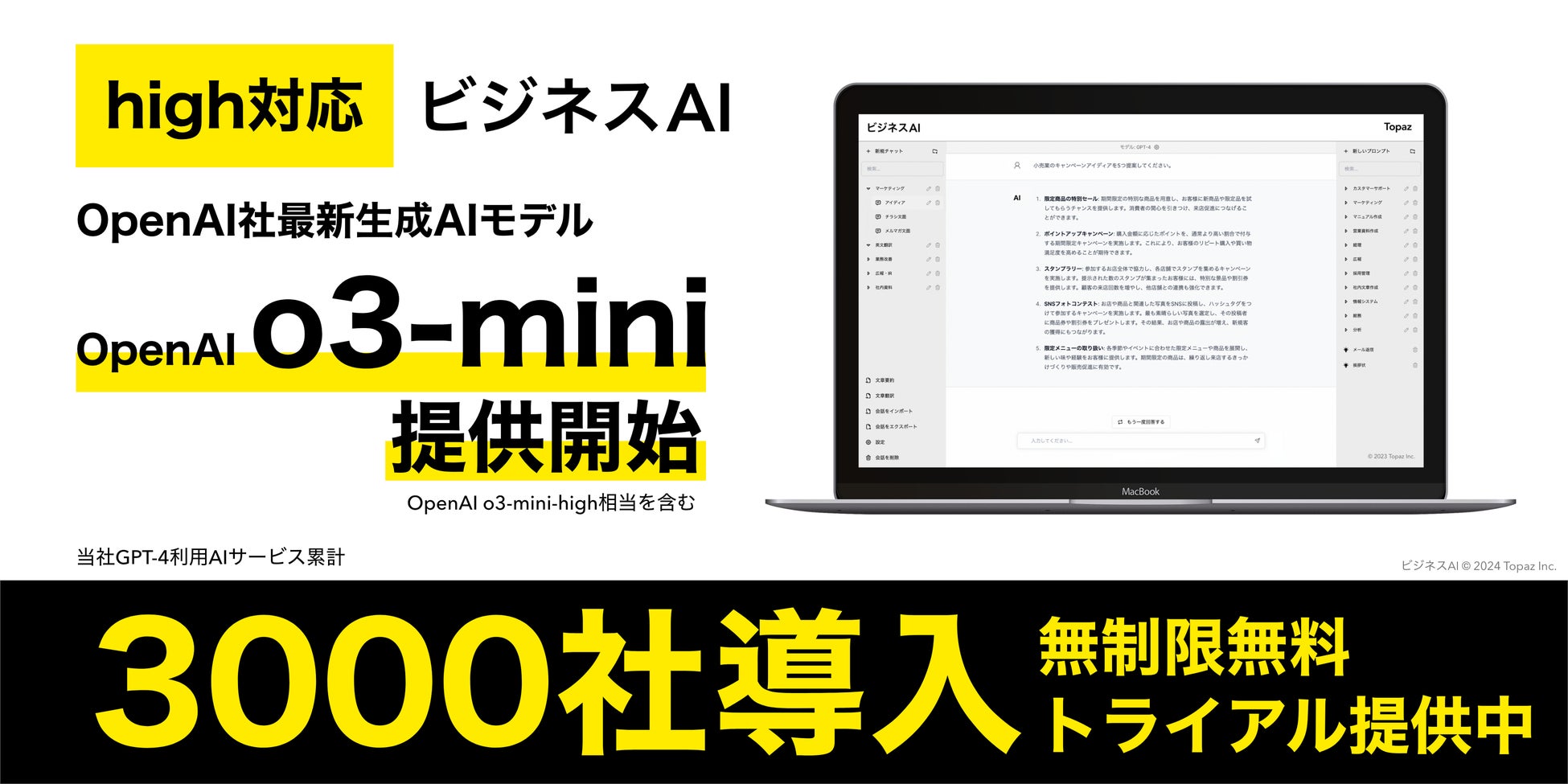 3000社超導入の生成AIチャットサービス「AIOne」「ビジネスAI」を提供するTopaz合同会社は、2025年2月1日(土) 7:00より、法人向け生成AIプラットフォーム「ビジネスAI」において、OpenAI o3-mini・OpenAI o3-mini-highを提供開始しました。