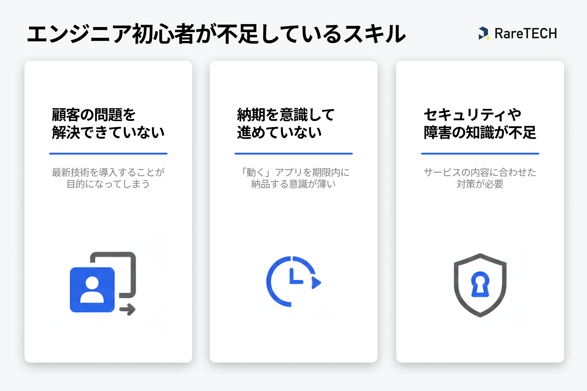 一方で、単にツールを操作できるだけでは現場の課題を解決できず、マネジメントや設計のスキルが不足する状況が続いています。クラウドを利用したシステムが一般的になった現在において、システムが高負荷にも耐えられるかつコストも最適化された設計を採用し、そのプロジェクトを推進するためのマネジメント力が重視されています。これらのセキュリティ対策や障害対策まで見通せる設計力は簡単に身につくものではありません。RareTECHのレポートではこの “マネジメント・設計スキルのギャップ” を重要な課題として位置づけています。