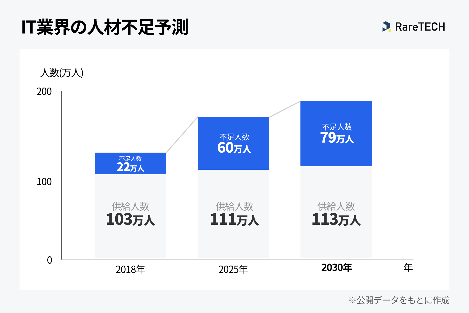 日本では2030年時点で 最大約79万人のIT人材が不足する と経済産業省や情報処理推進機構(IPA)が推計しており、特に クラウド・DX・サイバーセキュリティ・データサイエンス といった領域で需要が急増しています。これらの分野では教育供給が追いつかず、供給と需要のギャップが拡大しています。