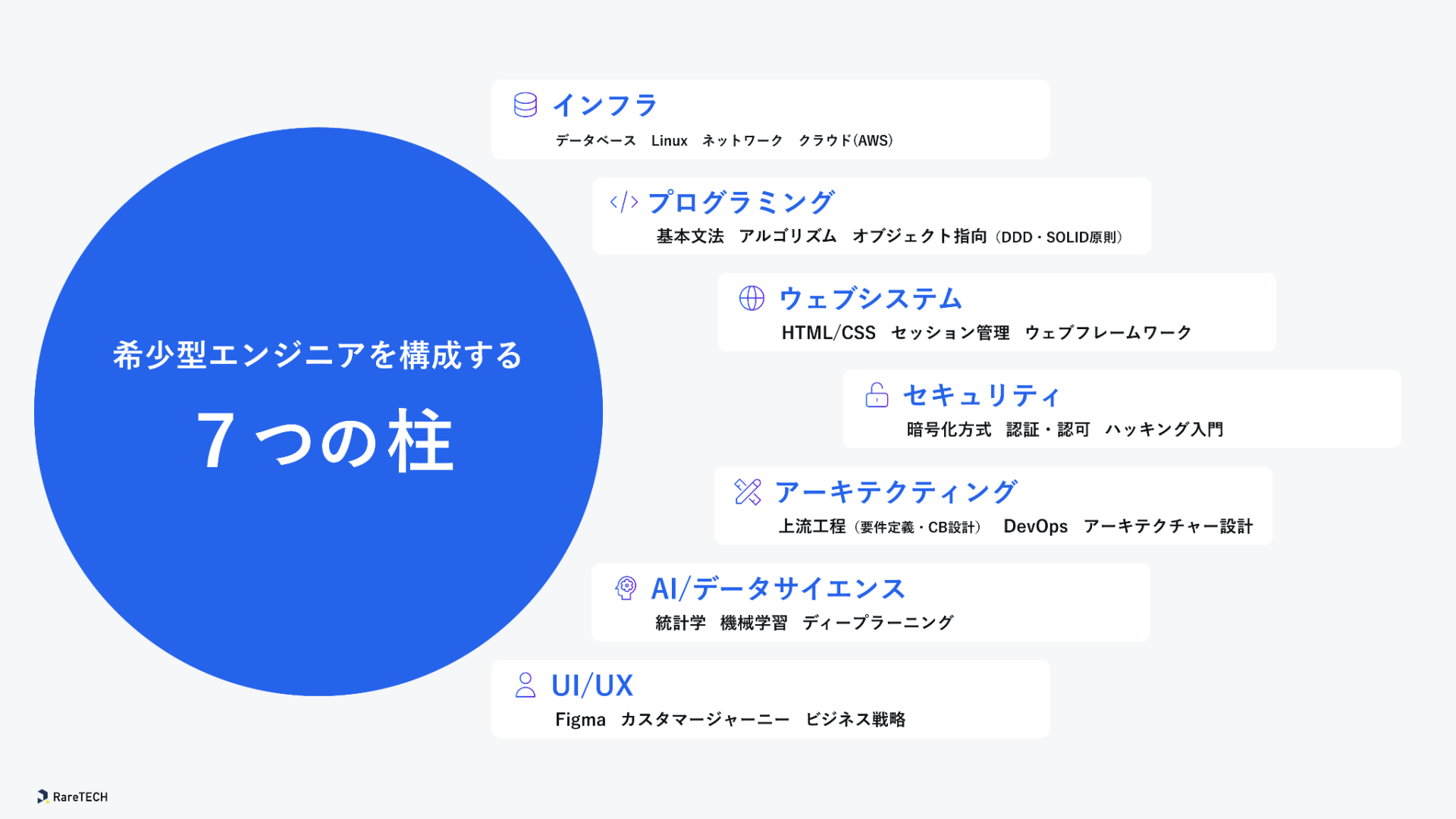 RareTECH(レアテック)は、希少型エンジニアを育成する2年制のITスクールです。 ネットワーク・Linux・プログラミング・クラウド・セキュリティ・AIなどの基礎知識を網羅できるだけでなく、人材不足が懸念されるマネジメントや設計などの実践的技術が習得できるカリキュラムを採用しています。