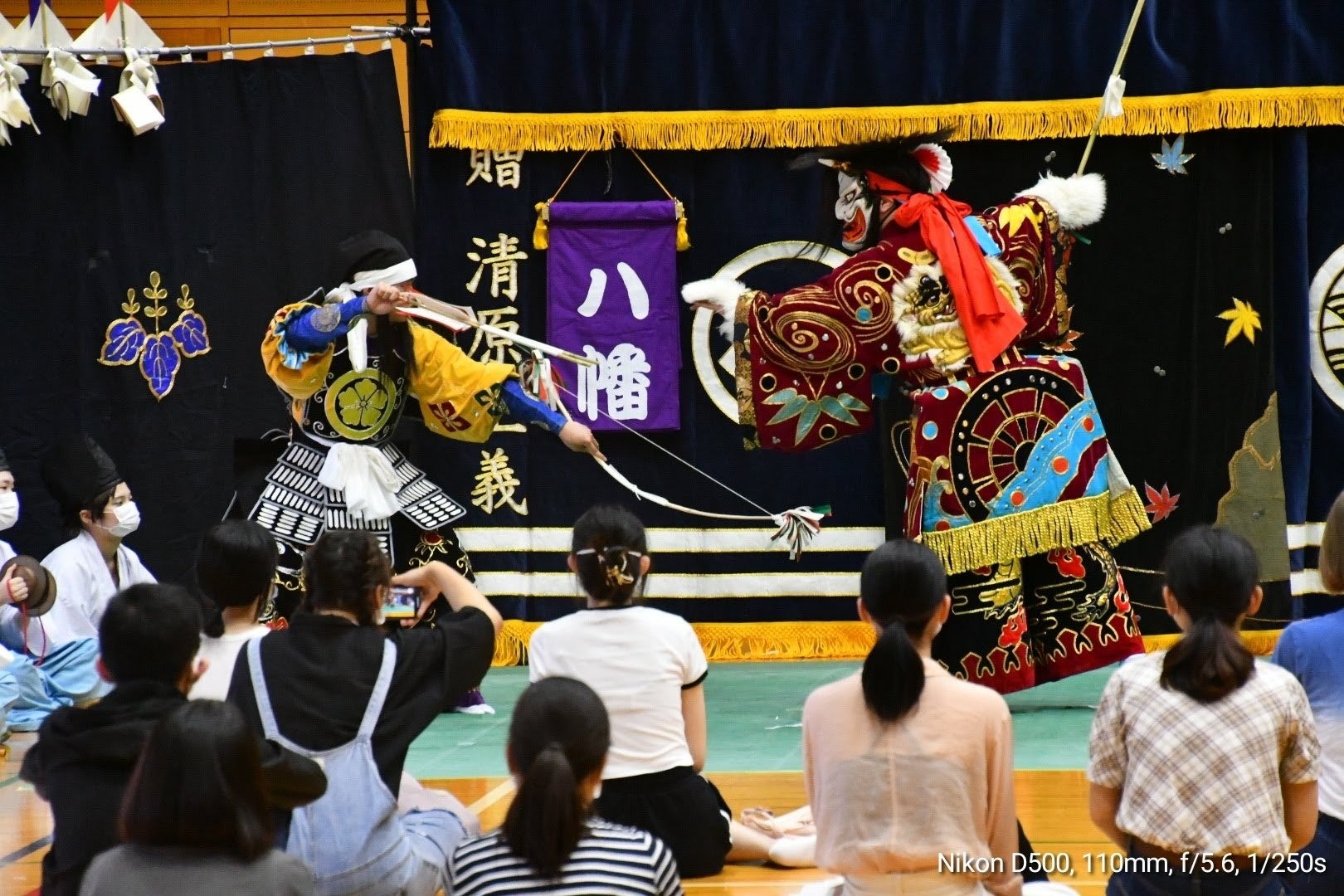 演目の観賞後は参加者による体験。笛、合戦、大蛇、舞の4つのパートに分かれ、参加しました。
