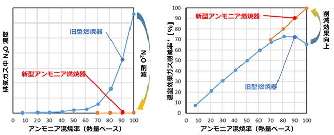 一方で,液体アンモニアは,天然ガスやアンモニアガスよりも燃焼性が低く燃えにくいため,アンモニア混焼率を高めた際,安定的なアンモニア燃焼と排気ガス中の温室効果ガスの排出抑制が課題となります。これまでは70%を超える高いアンモニア混焼率での運転時に,温室効果ガスの一種であり,CO₂の約300倍の温室効果を持つ亜酸化窒素(N₂O)が発生し,CO₂排出量を削減できても温室効果ガス削減にはつながらないことが課題となっていました。