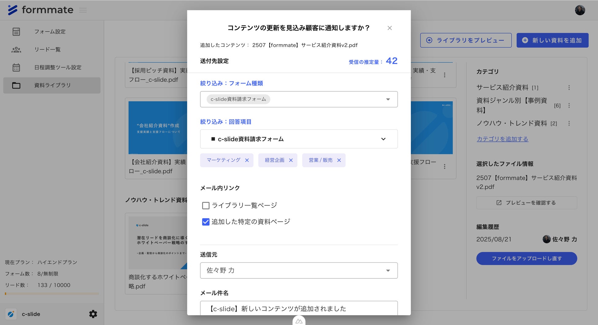 formmateのメール配信機能「1-Clickナーチャリング機能」とは、ライブラリに資料を追加した際に、1-Clickでメール配信ができる機能のことです。配信設定も詳細まで簡単に指定でき、配信後はアクセスを検知します。