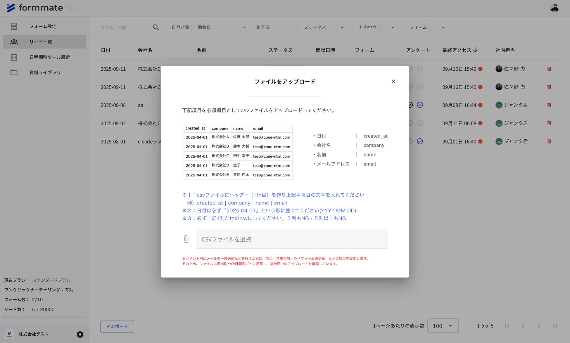 ① 「日付、会社名、名前、メールアドレス」の項目に合わせてCSVデータを用意し、アップロードします。