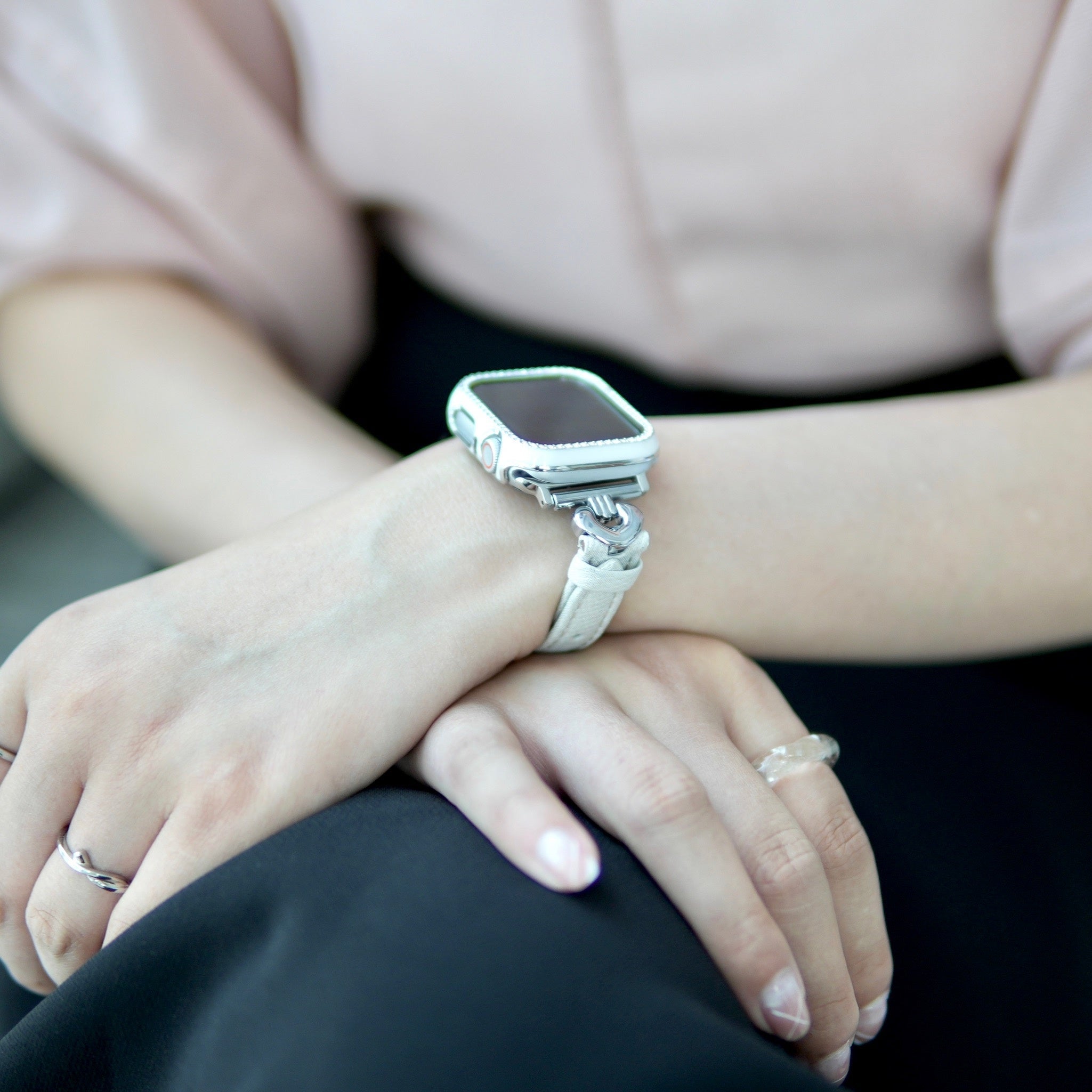 一見シンプルながら、連結部分にさりげなくハートをあしらった大人のフェミニンさが魅力のアップルウォッチバンドです。PUレザーの上品な質感が、きれいめコーデに良く合います。