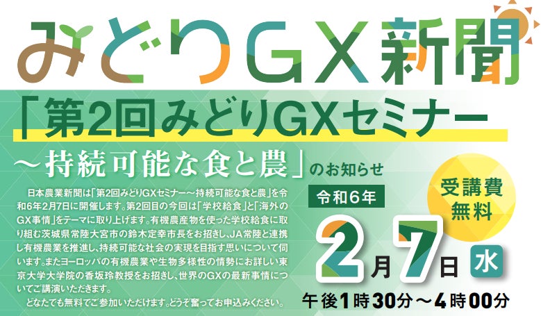 日本農業新聞は「第2回みどりGXセミナー~持続可能な食と農」を2月7日に開催します。第2回目は「学校給食」と「海外のGX事情」をテーマに取り上げます。有機農産物を使った学校給食に取り組む茨城県常陸大宮市の鈴木定幸市長をお招きし、JA常陸と連携して有機農業を推進し持続可能な社会の実現を目指す思いについて伺います。またヨーロッパの有機農業や生物多様性の情勢にお詳しい東京大学大学院の香坂玲教授には、世界のGXの最新事情についてご講演いただきます。