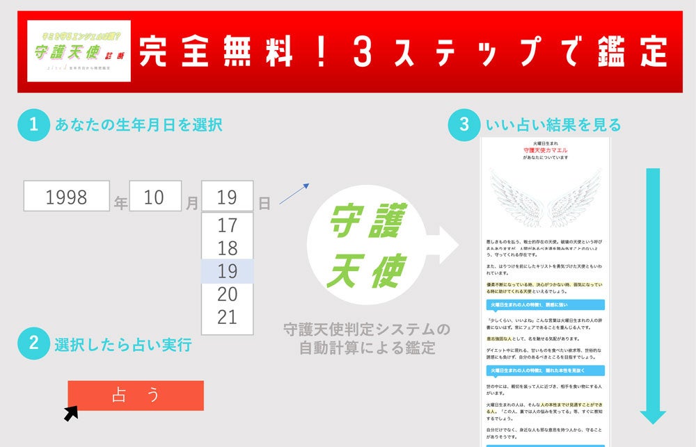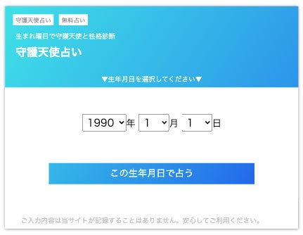 利用者は、自身の生年月日を選択することで利用料無料・登録不要で、西洋に伝わるガーディアンエンジェル(守護天使)は誰なのかを知ることができます。