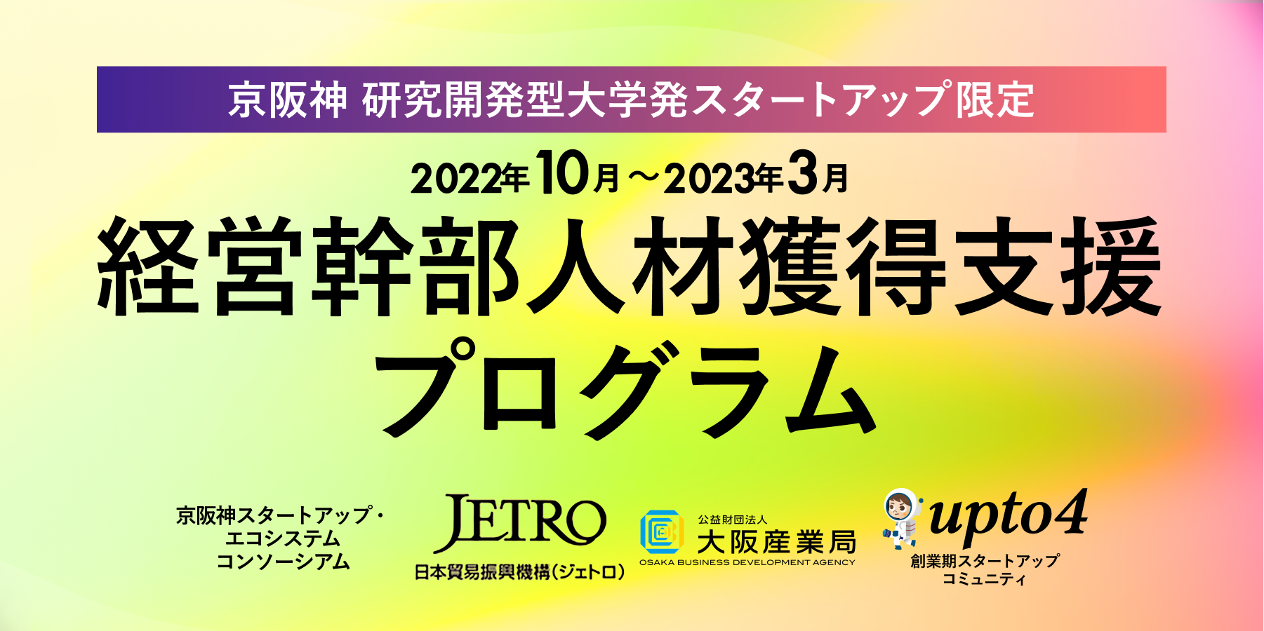 一方で、研究開発型の大学発スタートアップが、グローバルな販路開拓やビジネス展開をめざす際のチーム形成において、経営戦略やマーケティング、財務等に関した知見や国際感覚を有する経営幹部人材が不足しているという課題があります。この課題解決に向け、スタートアップ・エコシステム拠点都市機能強化プログラムの一環として、2022年10月20日(木)、24日(月)、27日(木)に【経営幹部人材獲得支援プログラム】を開催します。