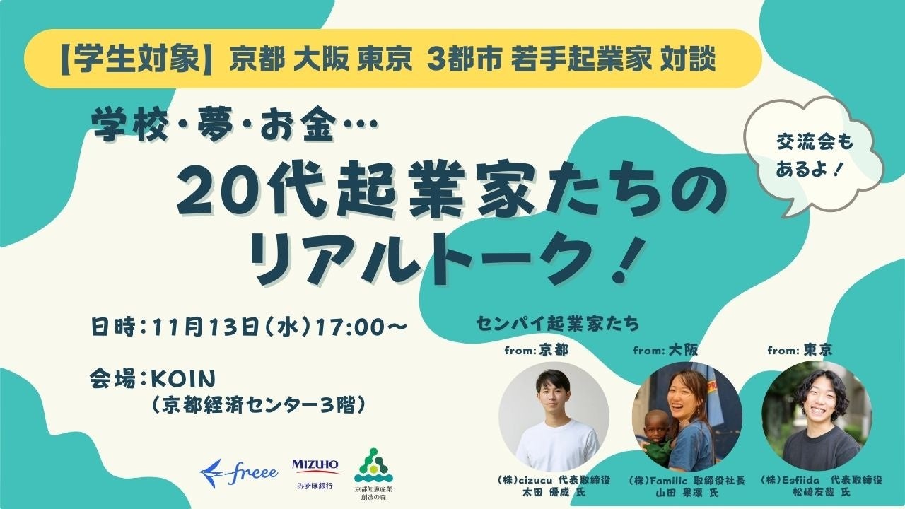 京都スタートアップ・エコシステム推進協議会の構成団体である一般社団法人京都知恵産業創造の森は、フリー株式会社(本社:東京都品川区、CEO:佐々木大輔、以下「freee」)と株式会社みずほ銀行と共催で、11月13日(水)に学生の起業支援を目的としたセミナー『\京都・大阪・東京 3都若手起業家対談/学校・夢・お金…20代起業家たちのリアルトーク!』を開催します。