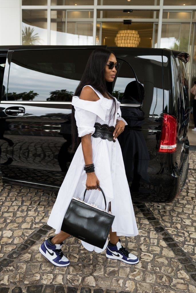 カンヌ国際映画祭期間中に、ナオミ・キャンベルが2022年秋冬プレコレクションより、ホワイトヘビーコットンポプリンを用いたオフショルダーのシャツドレスと、ブラックのフォーリングフレームバッグを合わせて着用しました。