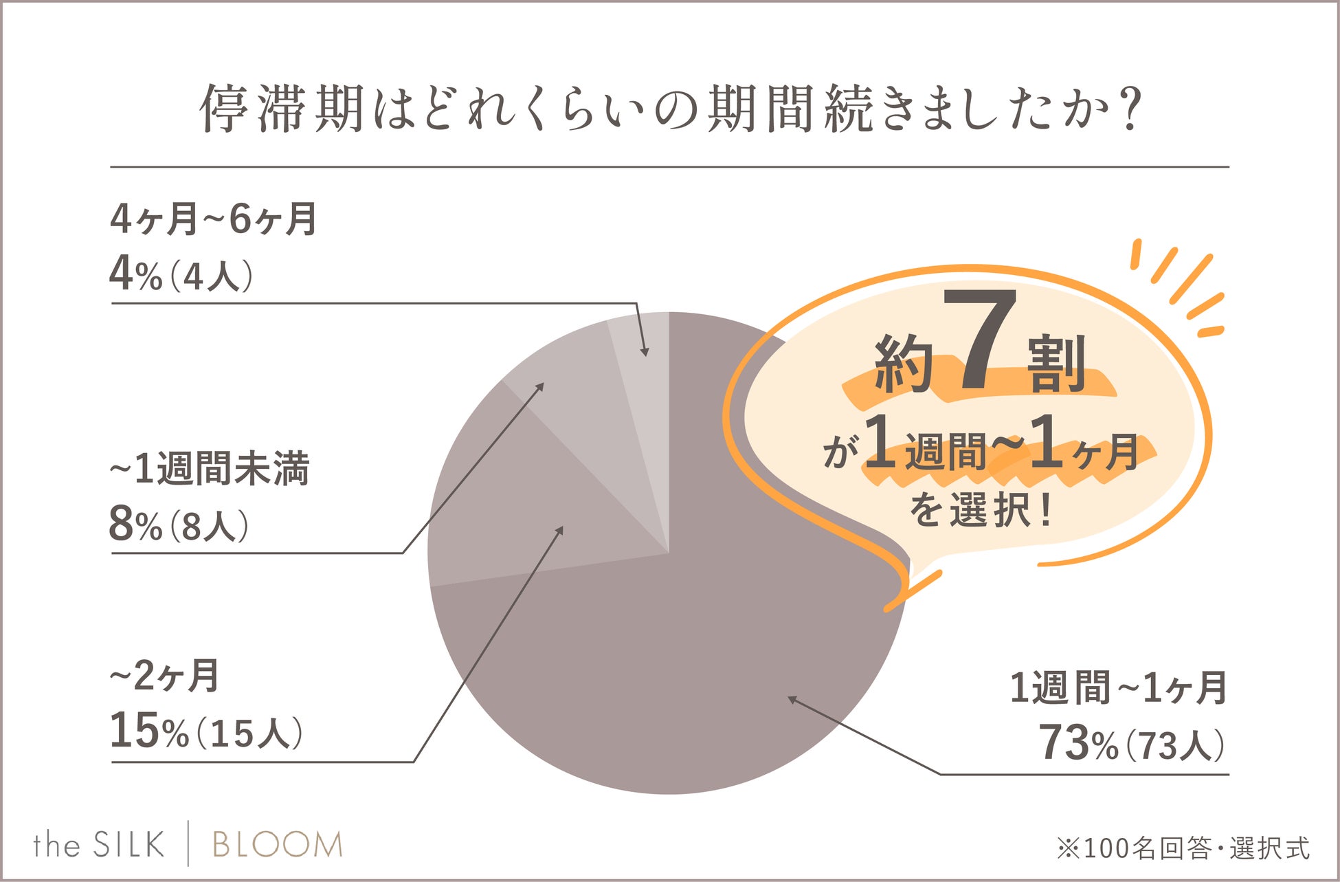 さらに乗り越えた方に停滞期が続いた期間を調査したところ、1週間~1ヶ月が約7割を占める結果となりました。