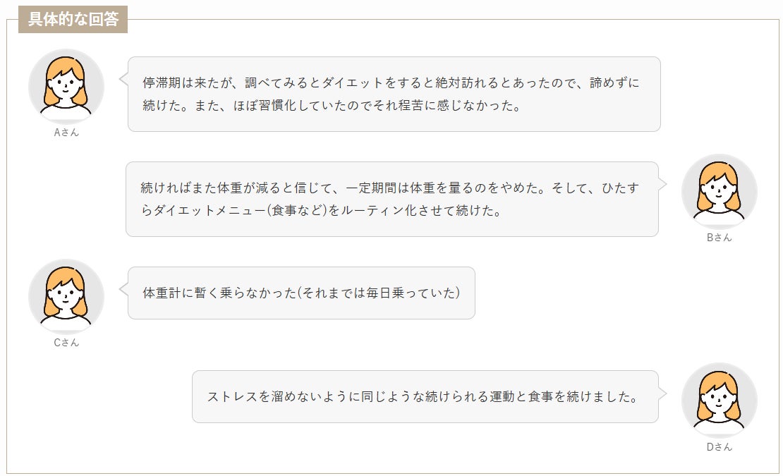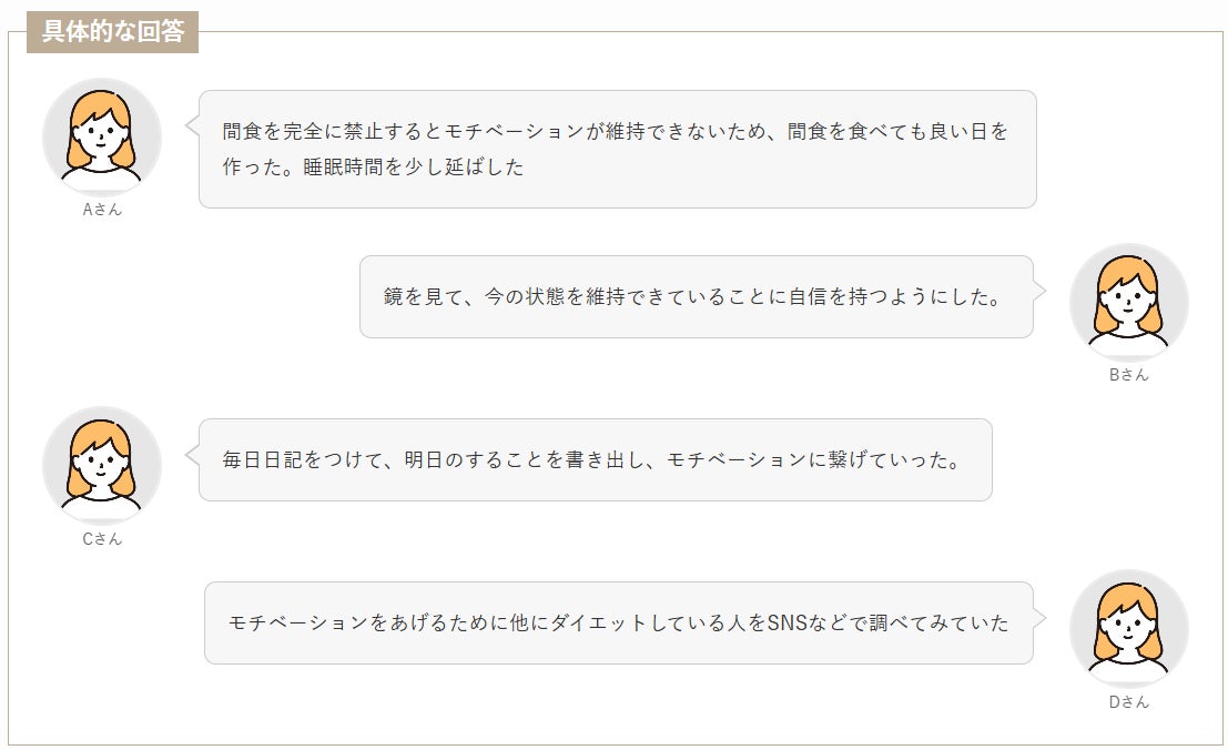 特に多かったのは「モチベーション維持」で、「食事管理」や「運動」の見直しも上位にランクインしています。