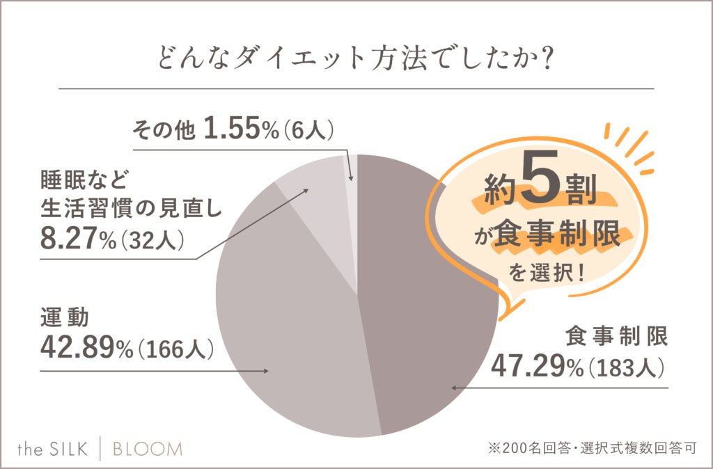 実際に体重が減ったダイエット方法を聞いたところ、「食事制限」を挙げる人が約5割、「運動」を挙げる人が4割以上いました。