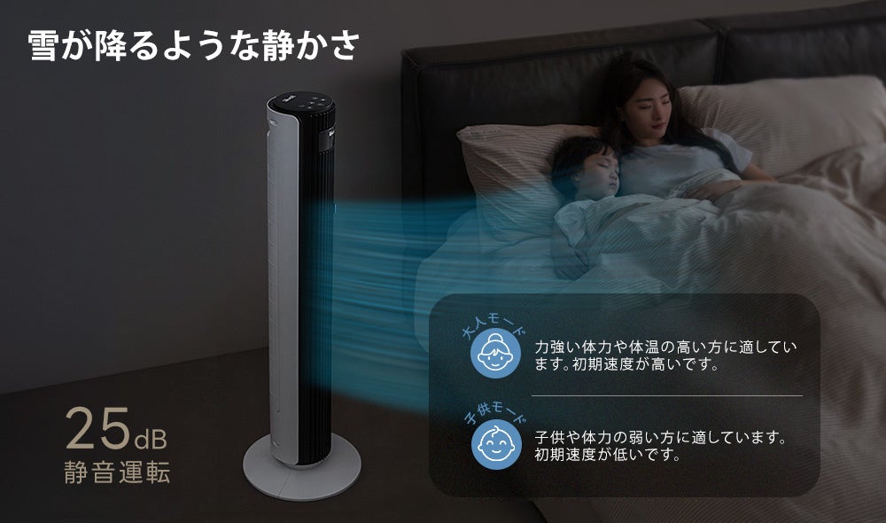 42インチタイプと36インチタイプともに搭載されているアドバンスドスリープモードは、温度と風量を最適化されたスリープモードで、就寝前、睡眠中、起床時の段階を考慮し、快適な風量と室温をセンサーが記憶します。タワーファン内部に温度センサーが搭載されており、室温の変化に関わらず自動的に快適な風量に調整されます。一晩中つけて就寝しても、朝起きた時に一般的な扇風機の風に当て過ぎた時のだるさや辛さを感じません。