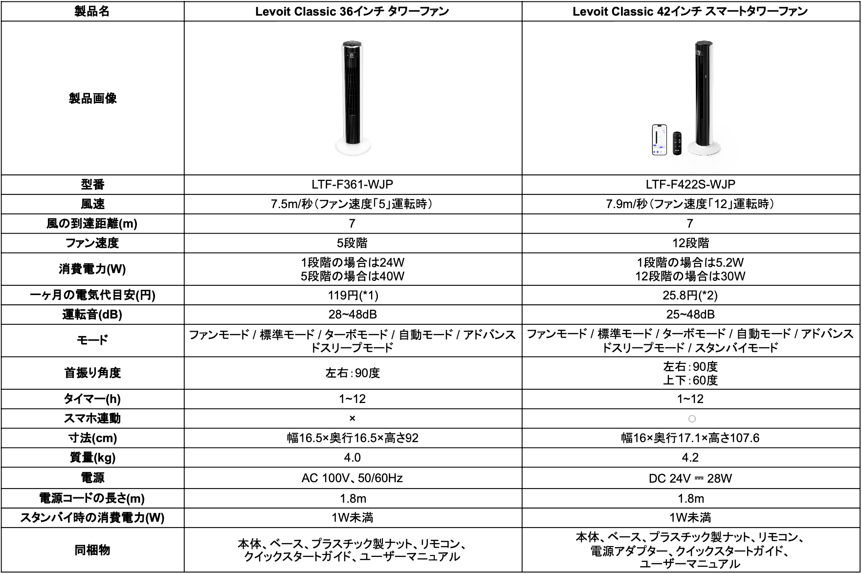 この度発売の「Levoit Classicタワーファン」は、スマート操作ができるDCモーター搭載の節電タイプ「Levoit Classic 42インチ スマートタワーファン」(以下42インチタイプ)と、価格がリーズナブルなコンパクトタイプ「Levoit Classic 36インチ タワーファン」(以下36インチタイプ)の2タイプがあります。主な製品特徴は以下となります。