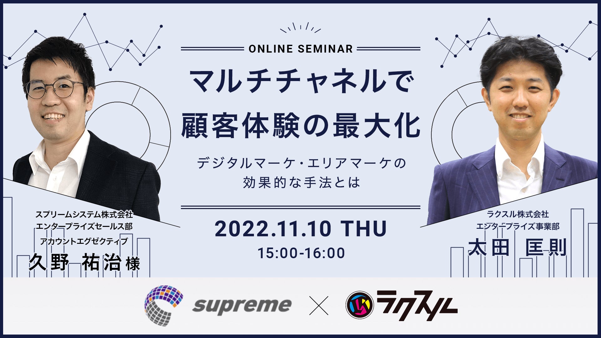 スプリームシステム株式会社(本社:東京都豊島区、代表取締役社長兼CEO:渡部 知博)は、2022年11月10日(木) 14時からラクスル株式会社と共同で「マルチチャネルで顧客体験の最大化 ~デジタルマーケ・エリアマーケの効果的な手法とは~」と題した無料オンラインセミナーを開催いたします。マルチチャネルでマーケティング施策を実施されている方は、是非ご参加ください。