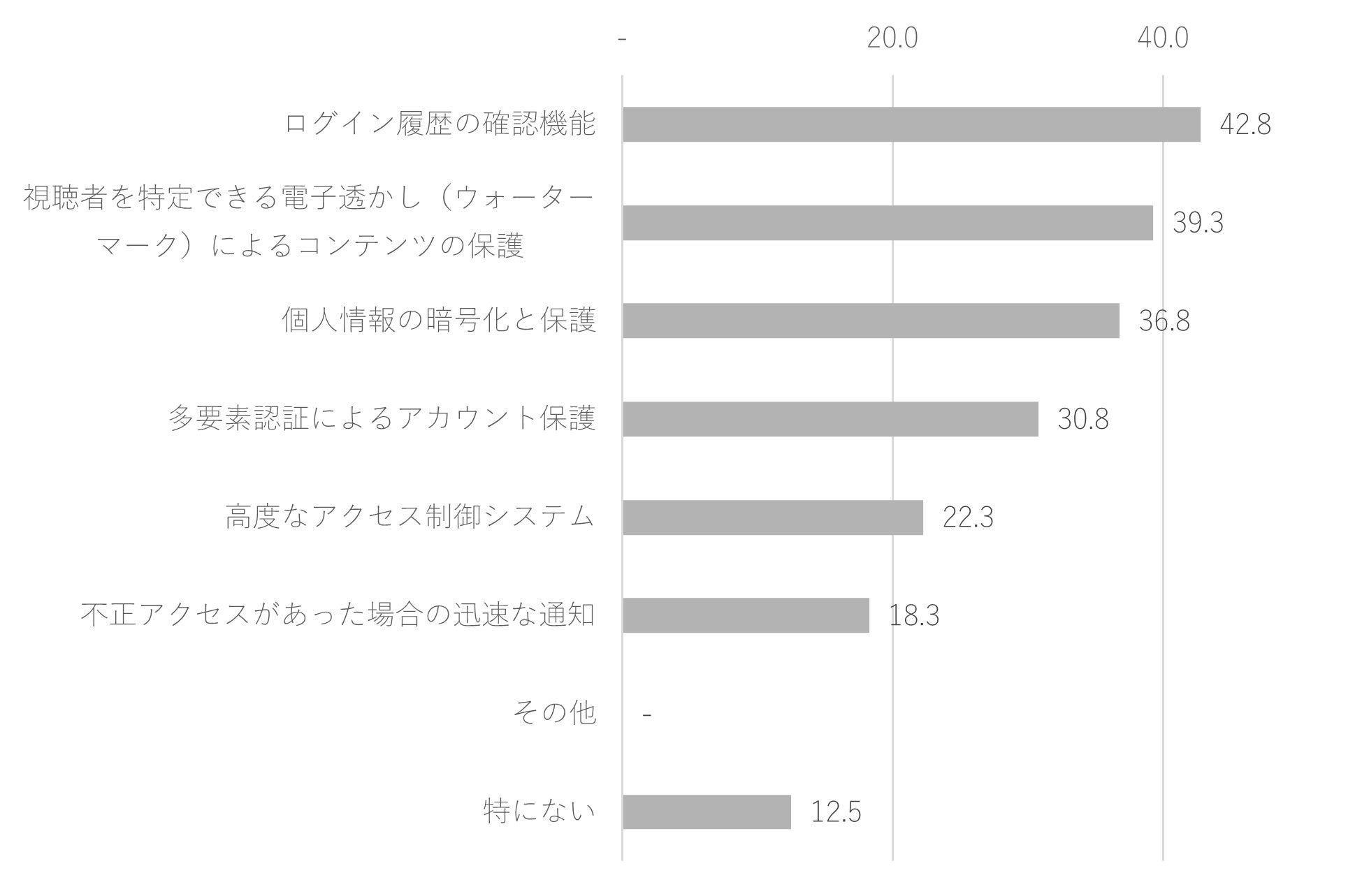 動画配信サービスに求めるセキュリティ対策は、「ログイン履歴の確認機能(42.8%)」、「視聴者を特定できる電子透かし(ウォーターマーク)によるコンテンツの保護(39.3%)」、「個人情報の暗号化と保護(36.8%)」でした。