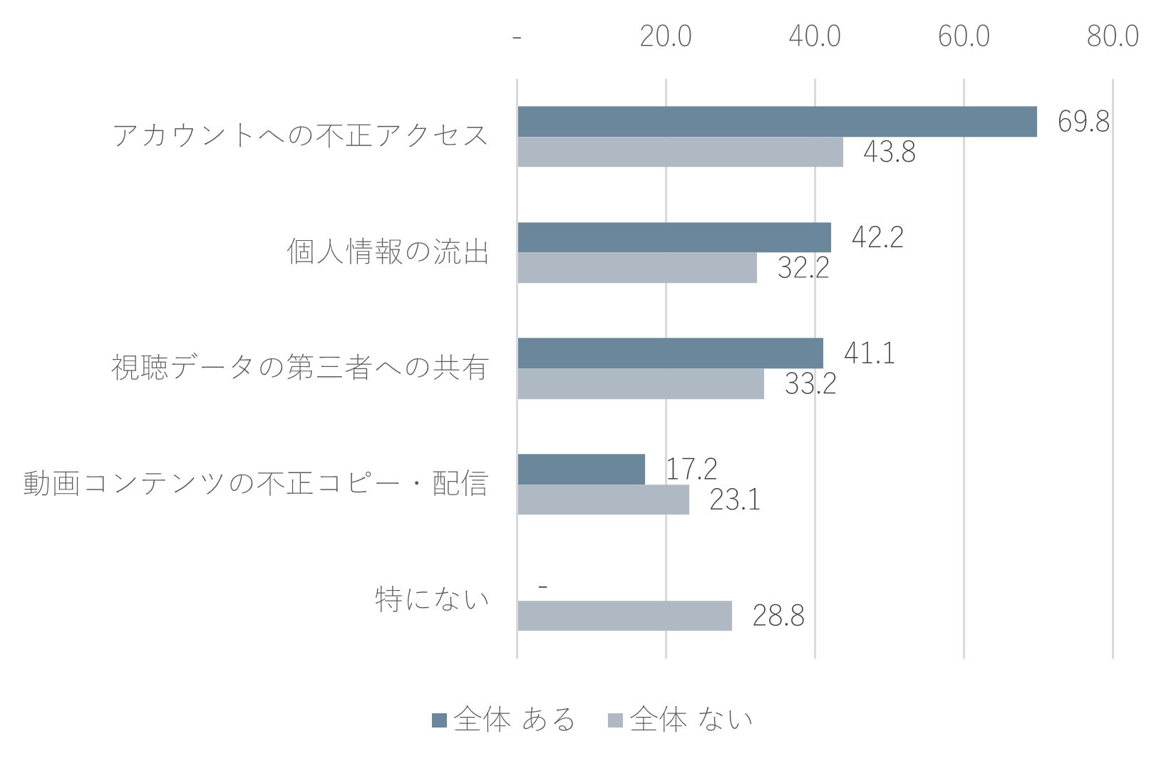 一方、上記で「経験なし」と回答したうち、同じくセキュリティのリスクとして不安や問題を感じている内容は、同じく「アカウントへの不正アクセス(43.8%)」、次いで「視聴データの第三者への共有(33.2%)」でした。
