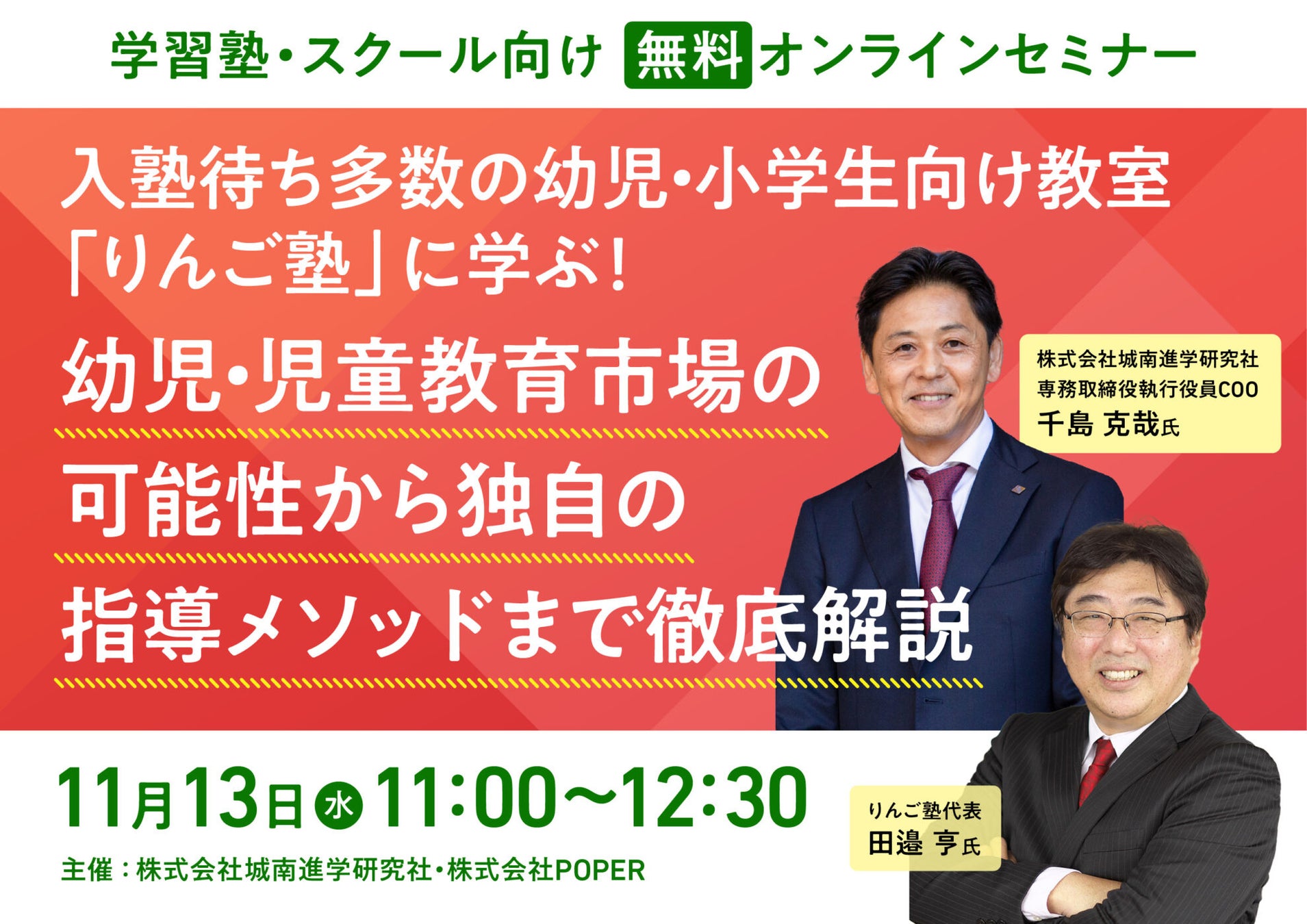 11月13日(水)、無料オンラインセミナー「入塾待ち多数の幼児・小学生向け教室『りんご塾』に学ぶ! 幼児・児童教育市場の可能性から独自の指導メソッドまで徹底解説」を開催します。