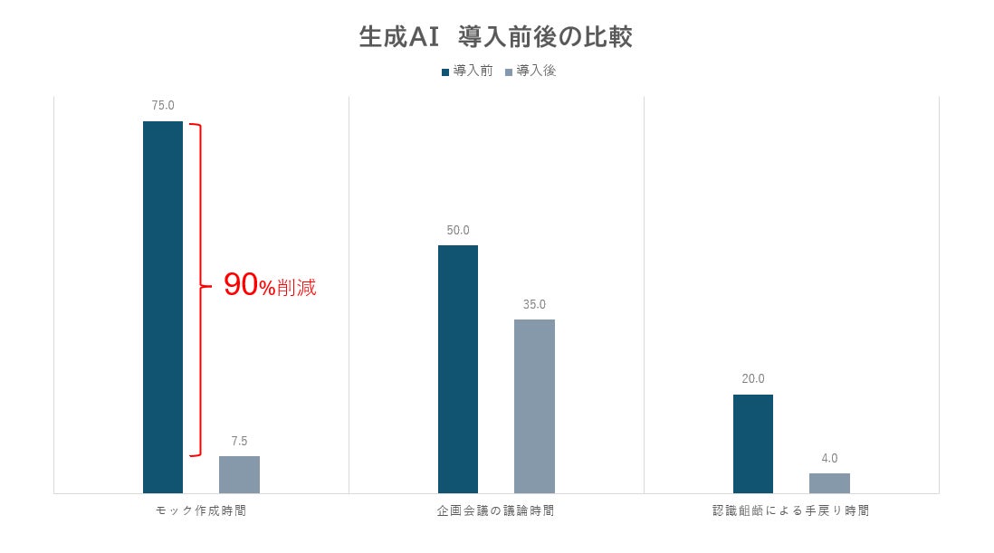 AI導入後、モック作成期間は約90%短縮、企画会議の議論時間は約50%短縮されました。