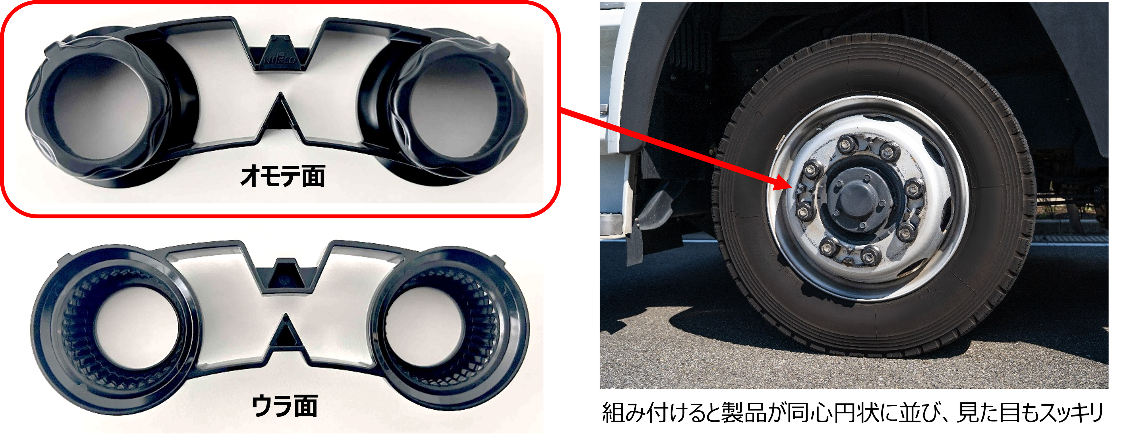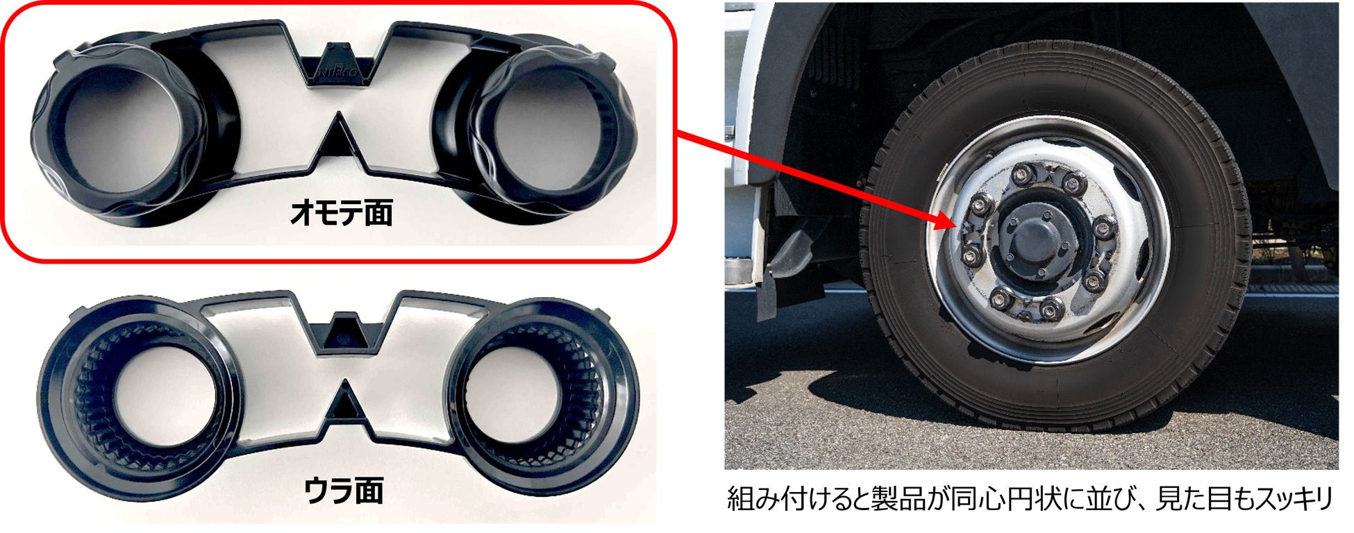 このたびニフコが量産を開始したホイールナットインジケーター「WaOSaFe™」は、既存の製品に比べホイールナットの緩みがひと目で視認可能、かつ組み付けが容易という機能性に加え、ホイール意匠に馴染むデザイン性を実現いたしました。「WaOSaFe™」は速やかで確実な日常点検を可能にし、トラックドライバーの作業負荷を低減することで車輪の脱落事故を予防します。