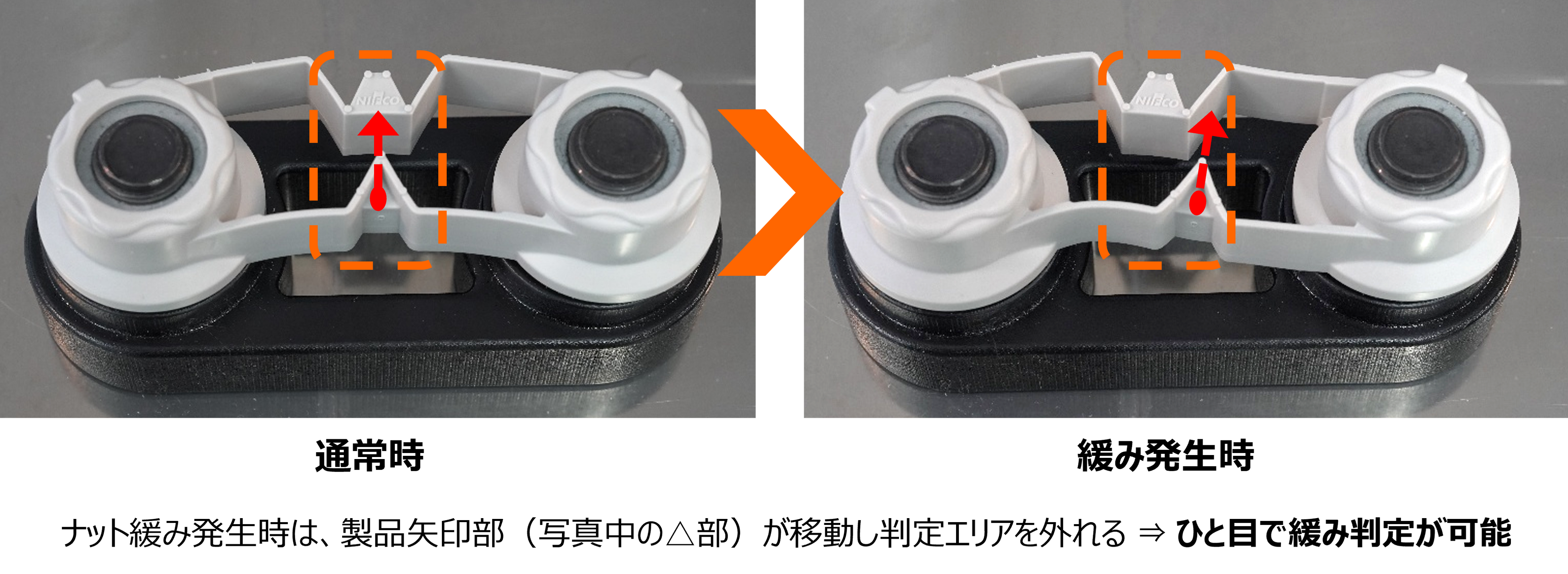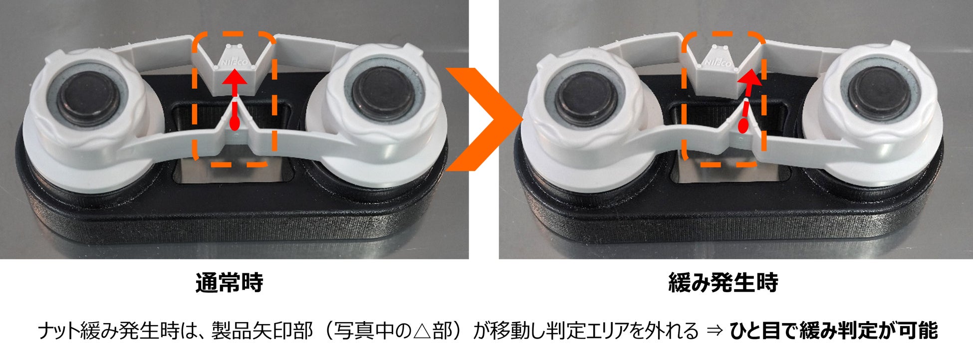 ホイールナットの緩みに応じてインジケーター部が可動し製品矢印部が判定エリアを外れることにより、ナットの増し締めが必要な緩み角度がひと目で正確に判定可能 ※特許出願中