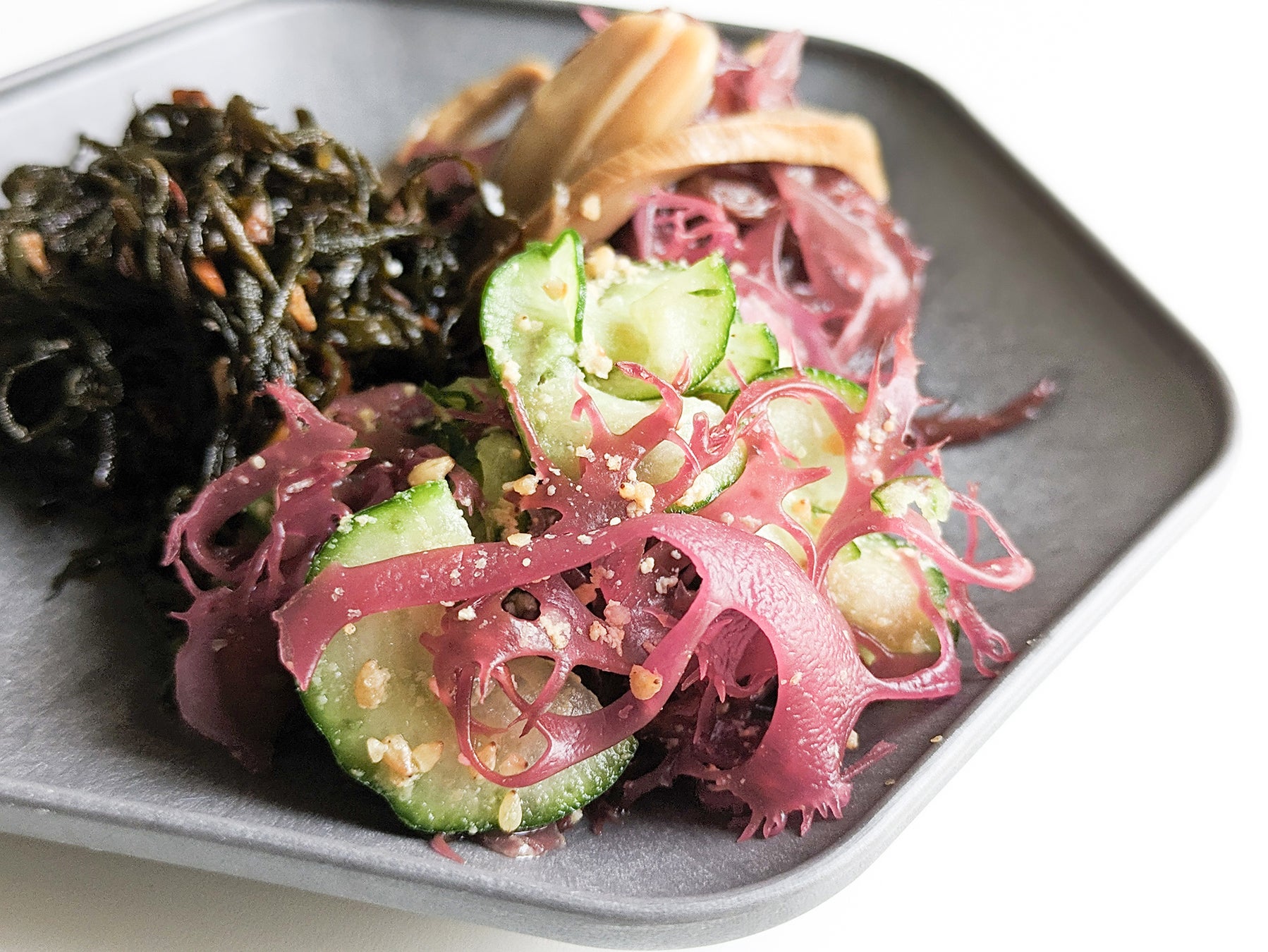 野菜がメインのサラダに少しワカメが入ったら、それはもう海藻サラダ。いやいや、海藻サラダというのなら、これくらい海藻入っていて欲しいな。そんな思いから作り上げる海藻屋さんの季節の海藻サラダシリーズ。しかし、100%海藻だと食べ飽きてしまう。季節の野菜と海藻の量を絶妙なバランスで整えました。サラダランチで十分メインを張れる一皿になっています。
