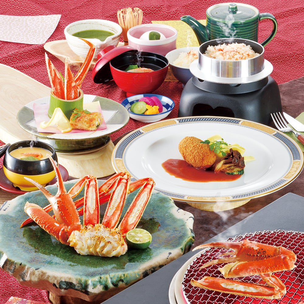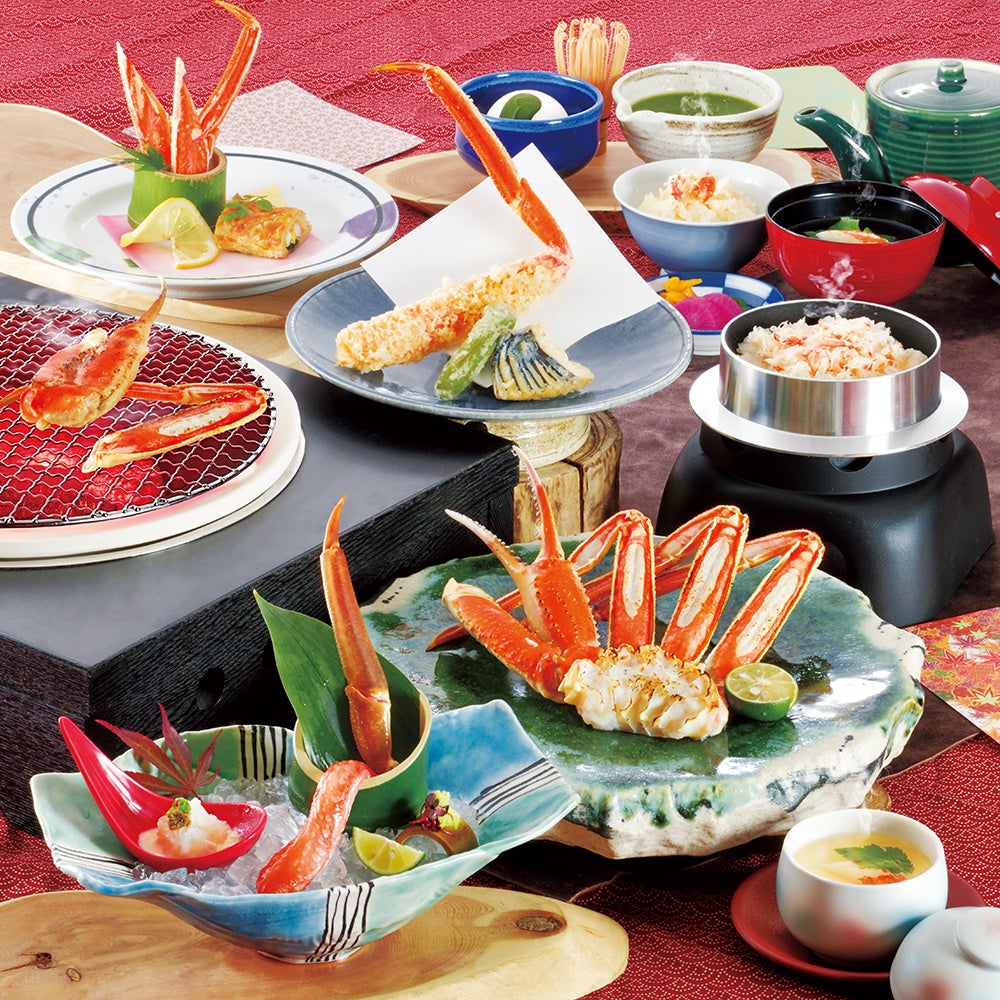 ◆前菜(・かに酢・かにつみれ椀・かにの湯葉巻きサラダ かにみそドレッシング)◆かに爪霜降り造り ◆かに茶碗蒸し◆ズワイかに半身焼◆厳選ズワイかに かにみそ甲羅焼◆かにしゃぶ小鍋◆かに特大天ぷら ◆道楽巻◆汁物◆アイスクリーム お抹茶かけ※西日本地区全店舗でご利用いただけます。