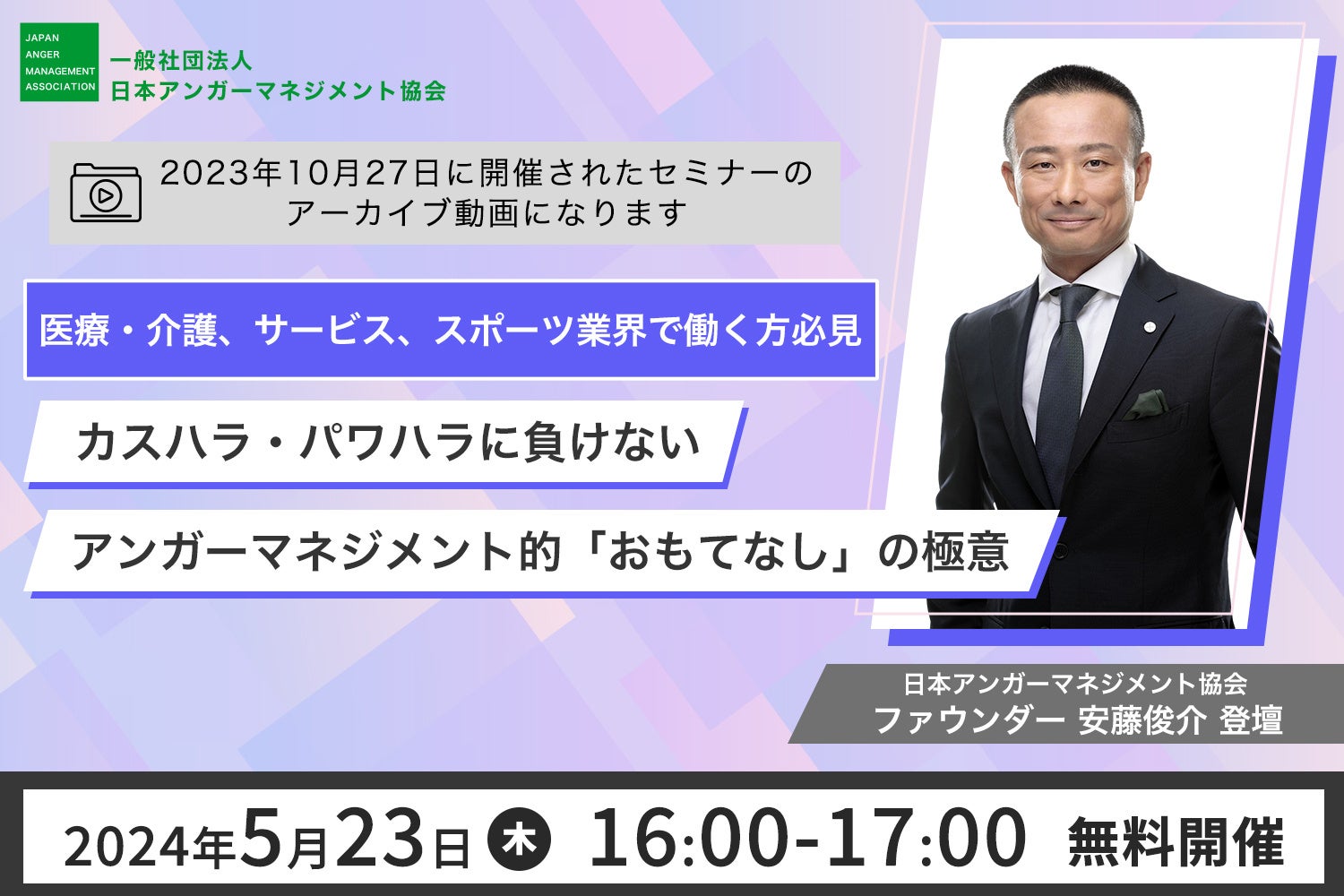 今回は2021年にオンラインイベント “アンガーマネジメントで「しない」「させない」カスタマーハラスメント” を開催した一般社団法人日本アンガーマネジメント協会ファウンダー 安藤俊介により、昨年10月に実施したハラスメント対策セミナーのアーカイブ動画を配信します。